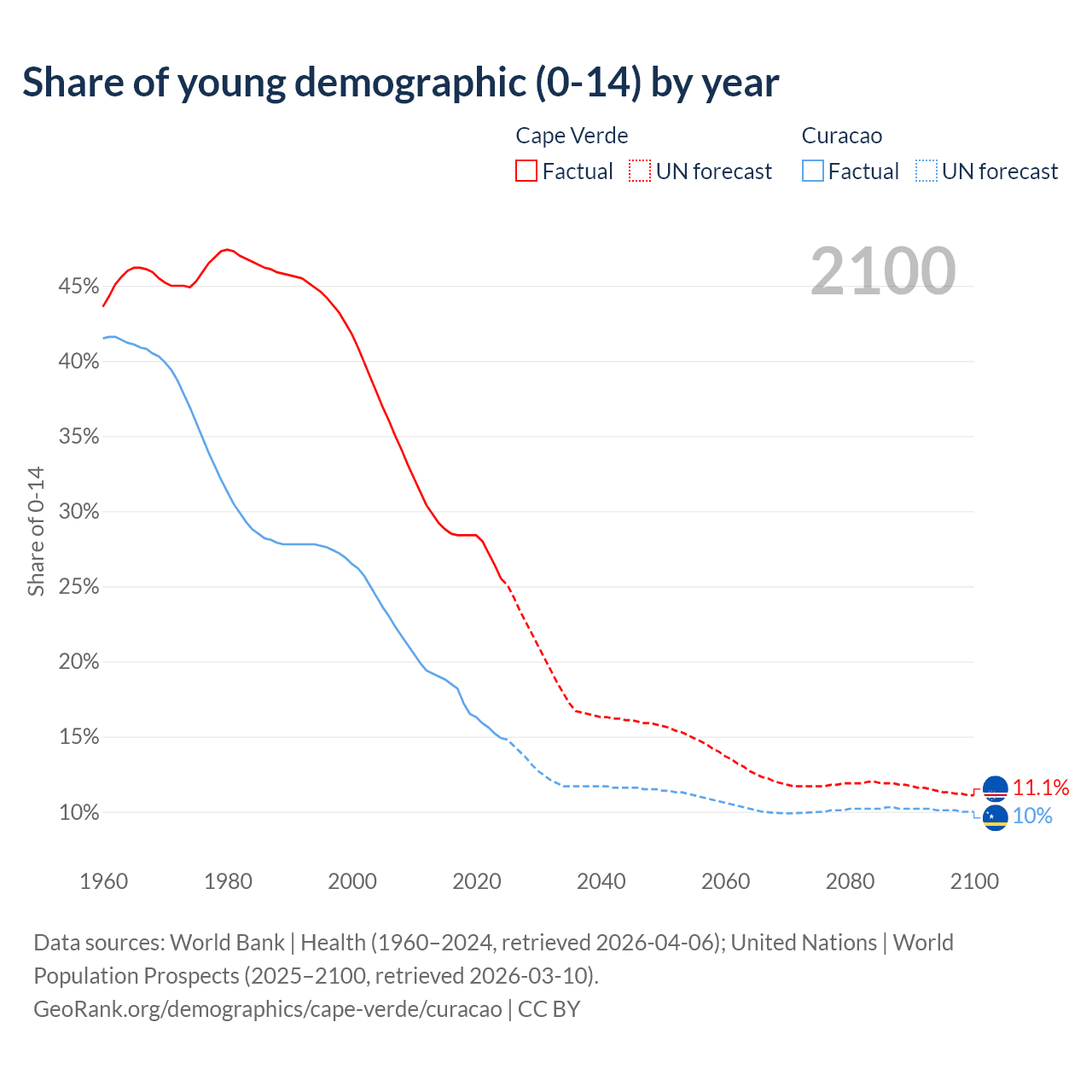 - The share of young demographic (0-15 years old) in Cape Verde is 25.5% vs 14.9% in Curacao.