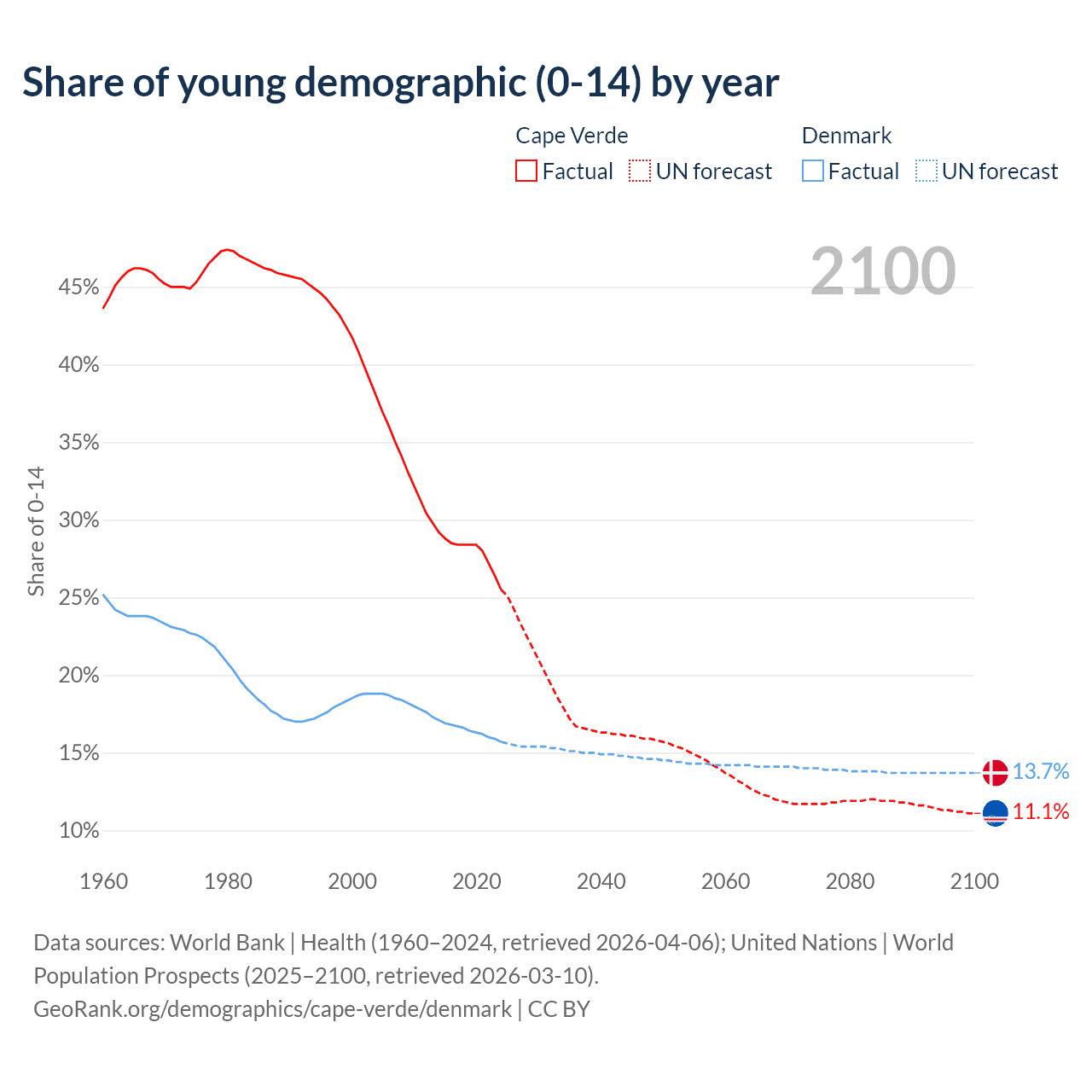 - The share of young demographic (0-15 years old) in Cape Verde is 25.5% vs 15.7% in Denmark.