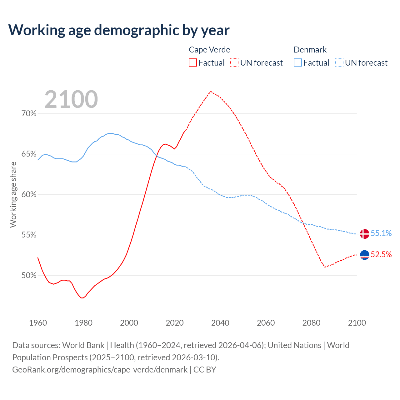 - Cape Verde has 359K working age adults (aged 15-64) vs 3.83M in Denmark.