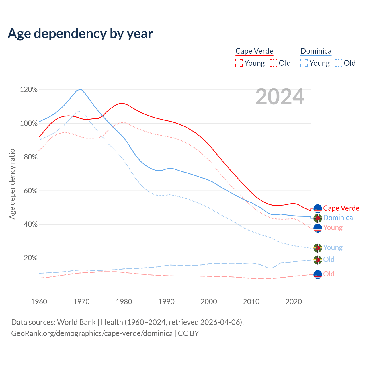 - Cape Verde is ranked 110/196 by median age (oldest to youngest) vs 66/196 for Dominica.