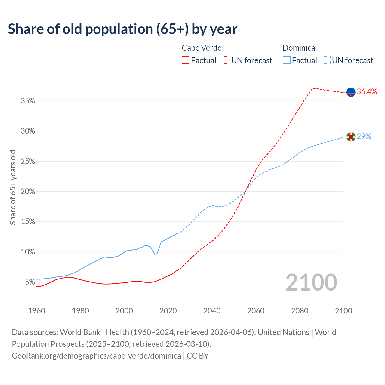 - The share of old-age demographic (65+) in Cape Verde is 6.86% vs 13% in Dominica.