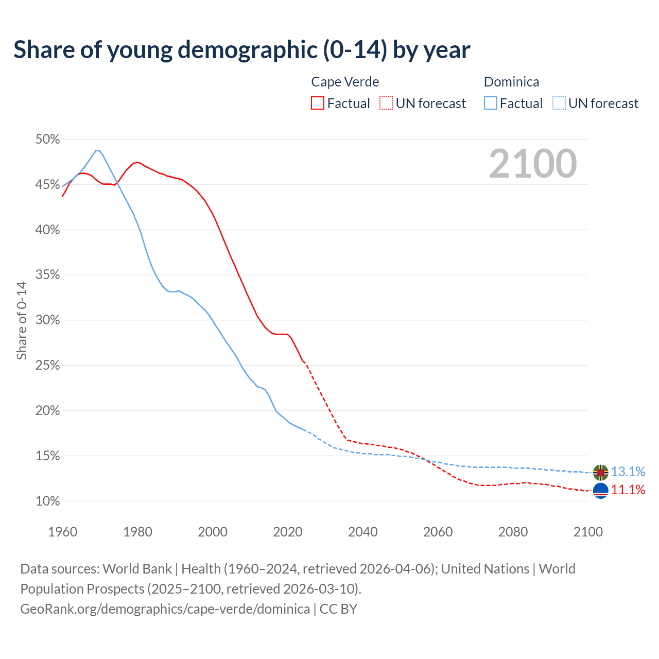 - The share of young demographic (0-15 years old) in Cape Verde is 25.5% vs 17.9% in Dominica.
