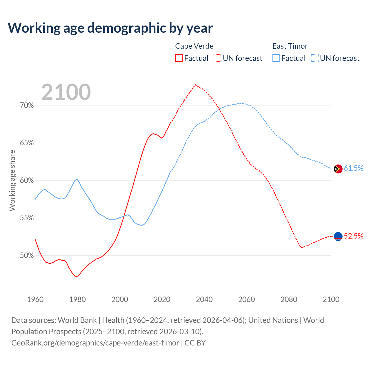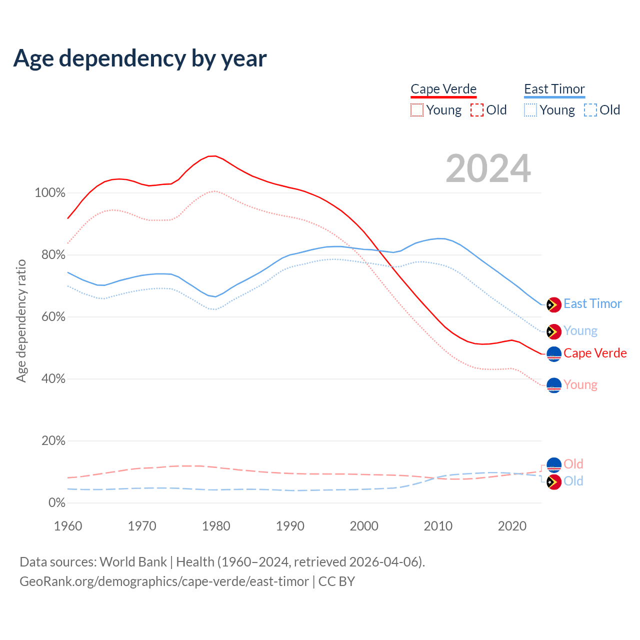 - The share of old-age demographic (65+) in Cape Verde is 6.86% vs 5.28% in East Timor.