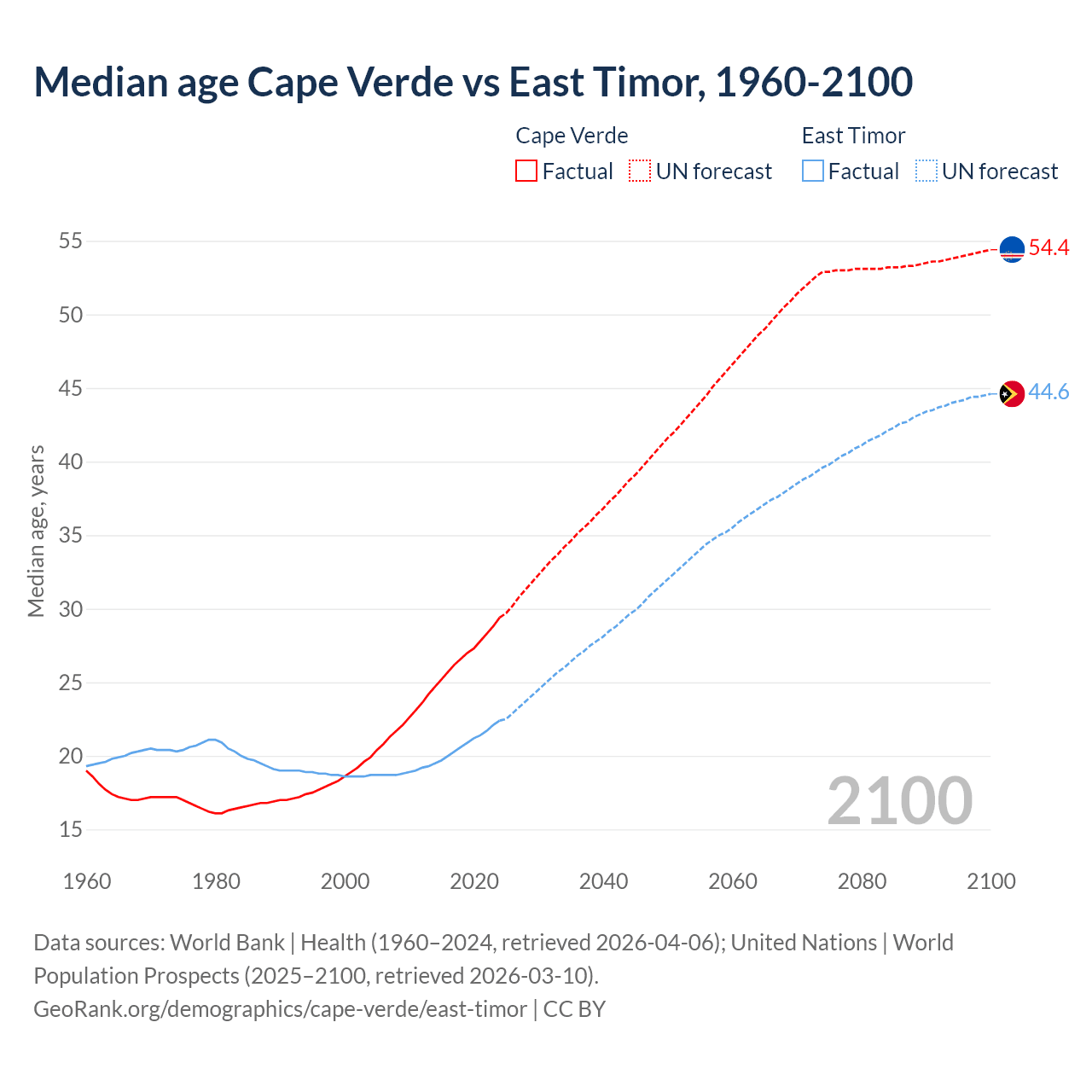 - Cape Verde is ranked 110/196 by median age (oldest to youngest) vs 145/196 for East Timor.