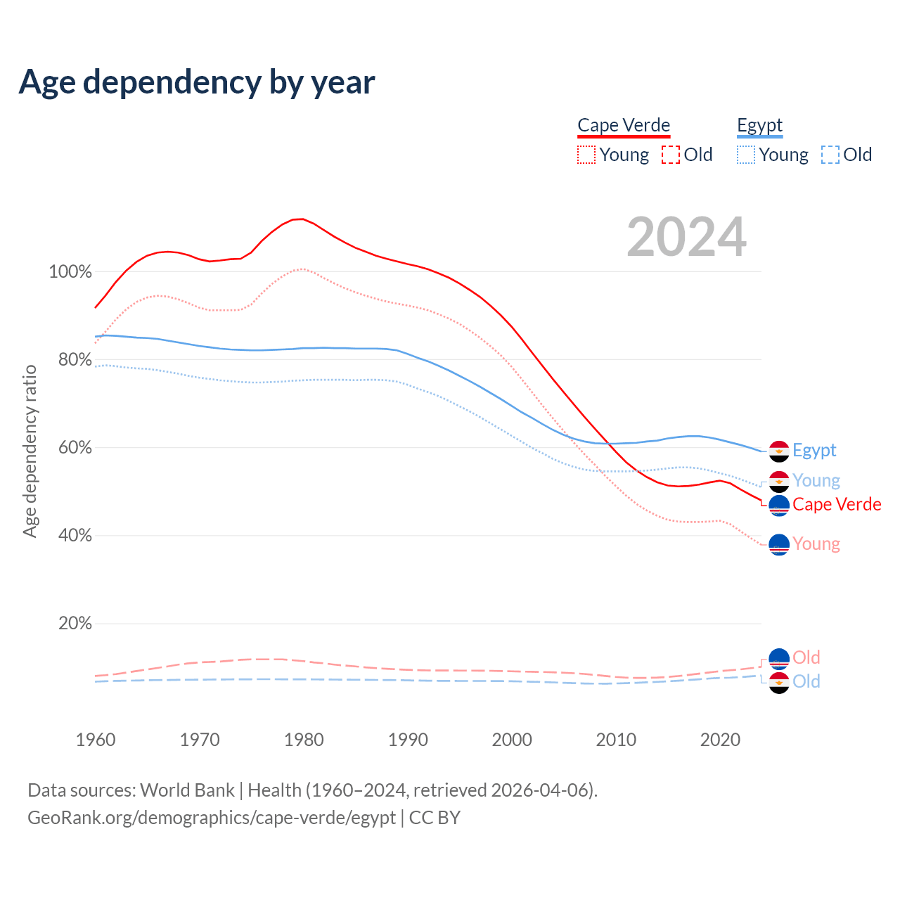 - Cape Verde is ranked 110/196 by median age (oldest to youngest) vs 133/196 for Egypt.