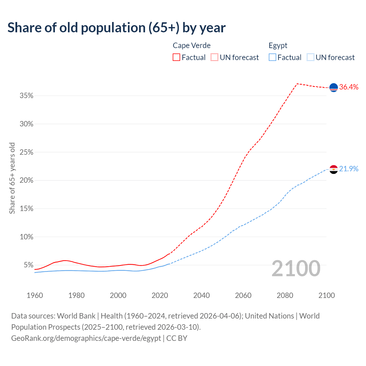 - The share of old-age demographic (65+) in Cape Verde is 6.86% vs 5.12% in Egypt.