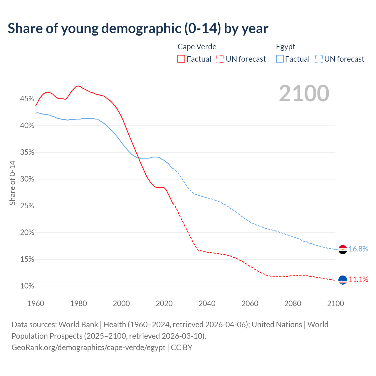 - The share of young demographic (0-15 years old) in Cape Verde is 25.5% vs 32% in Egypt.