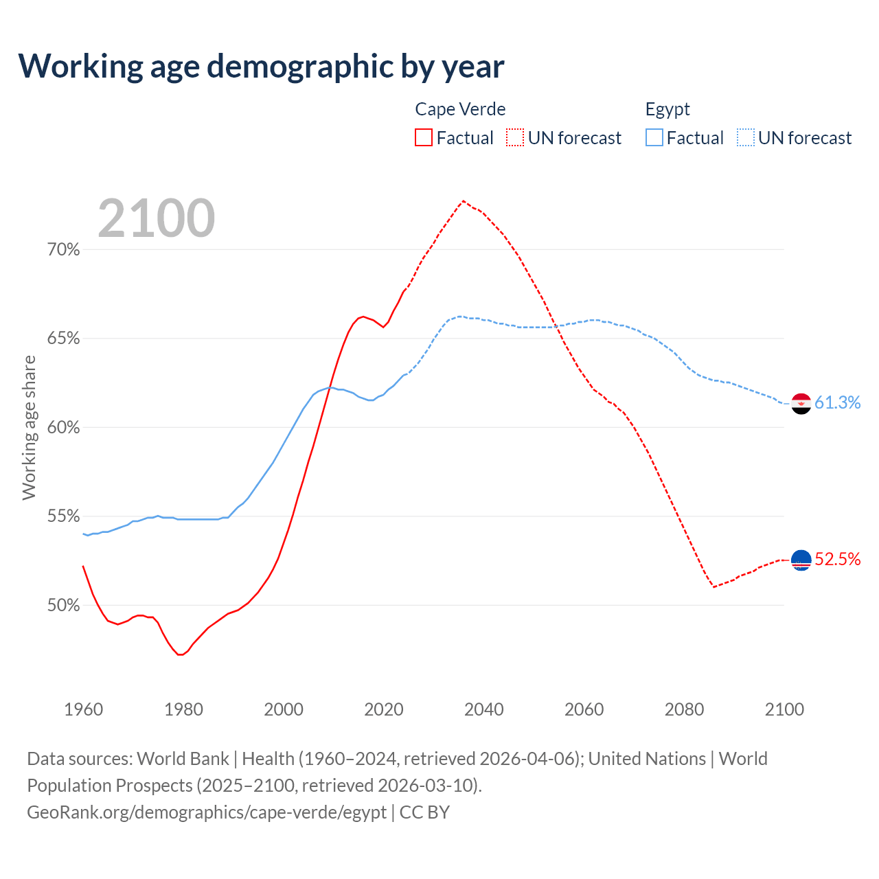 - Cape Verde has 359K working age adults (aged 15-64) vs 75.9M in Egypt.