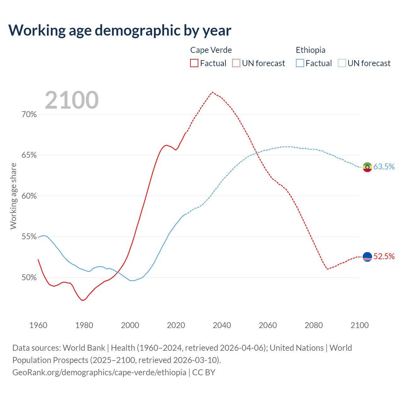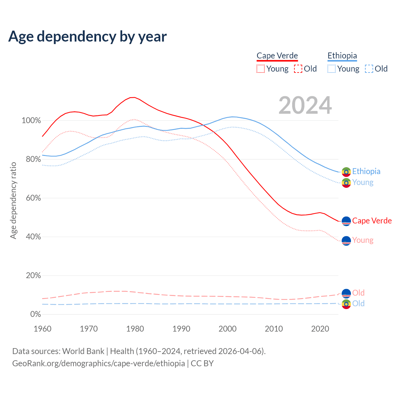 - The share of old-age demographic (65+) in Cape Verde is 6.86% vs 3.23% in Ethiopia.