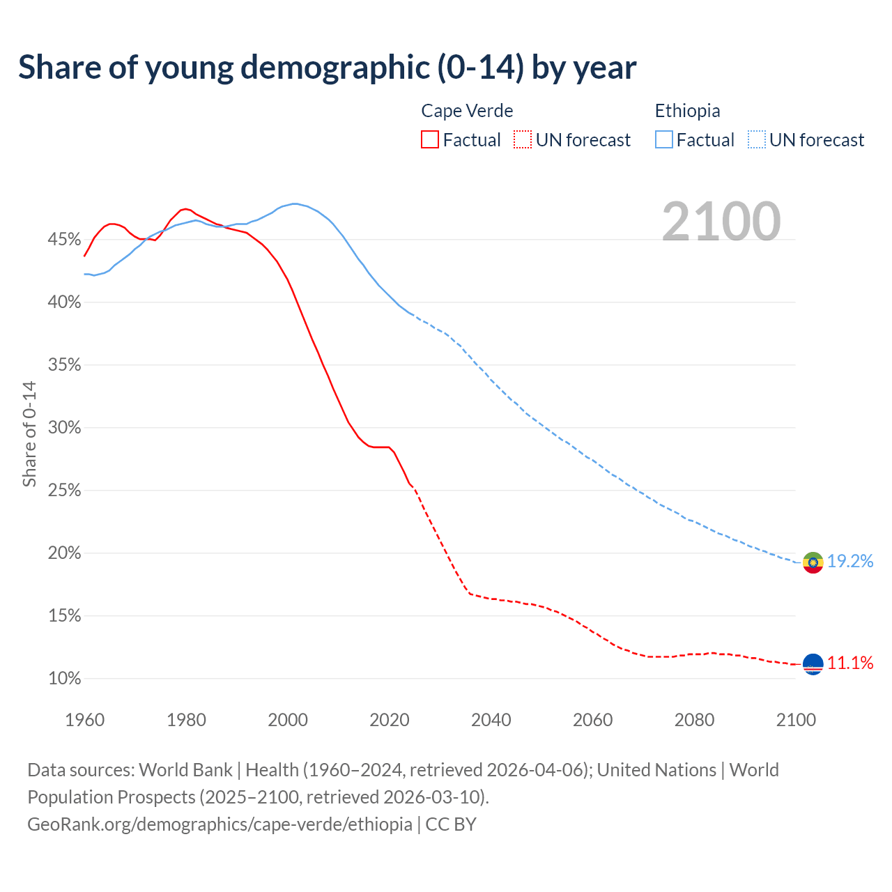 - The share of young demographic (0-15 years old) in Cape Verde is 25.5% vs 39.1% in Ethiopia.