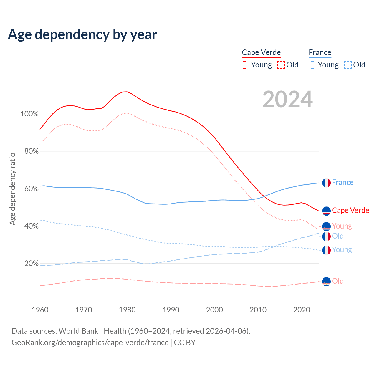 - Cape Verde is ranked 110/196 by median age (oldest to youngest) vs 29/196 for France.