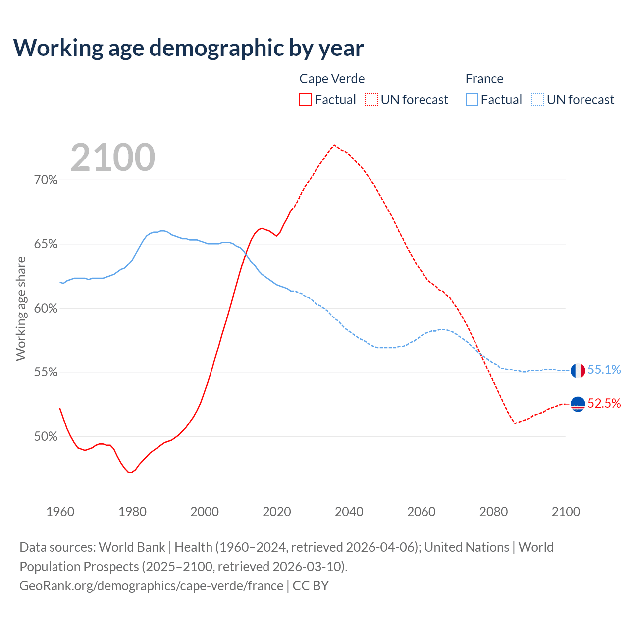 Median age Cape Verde vs France, 1960-2100