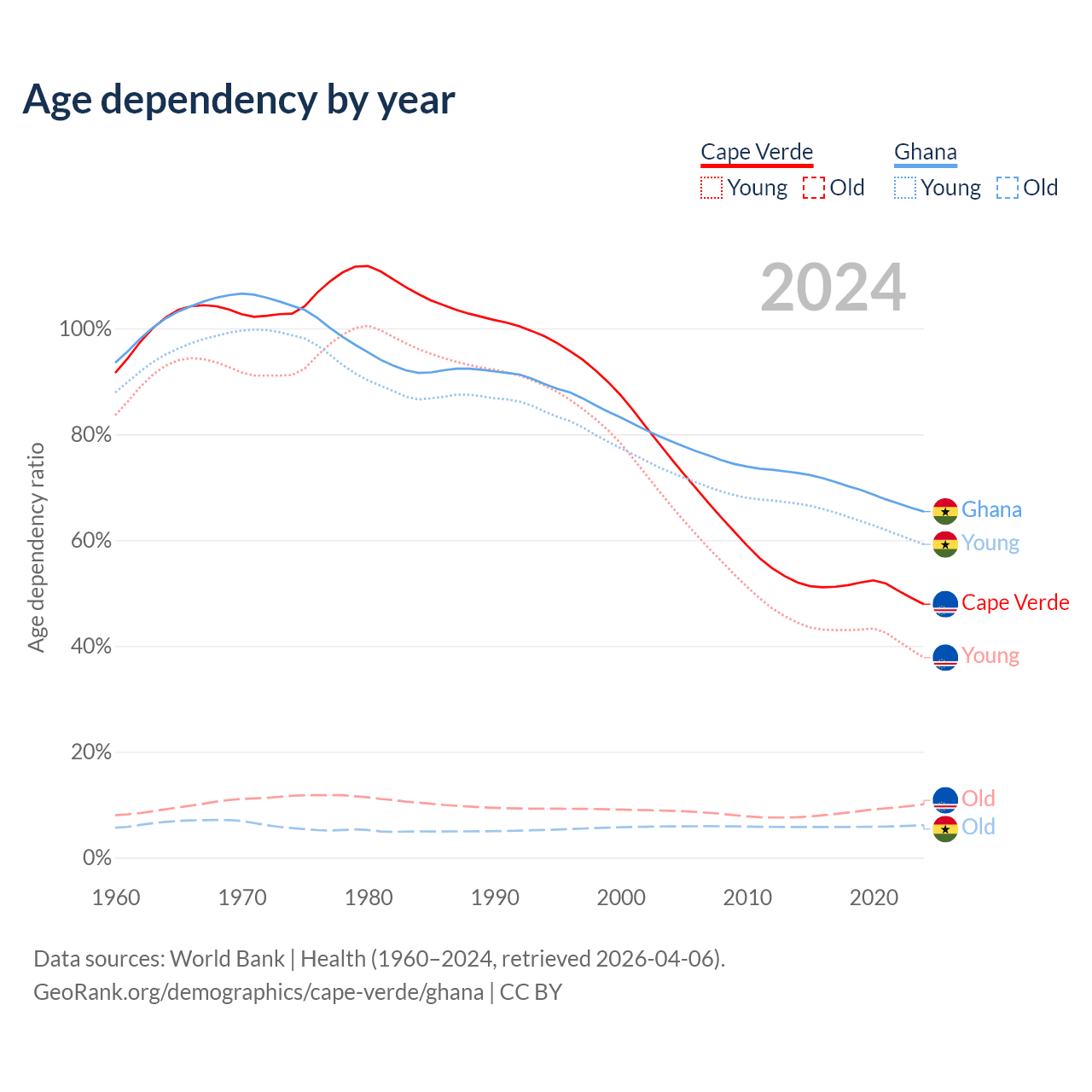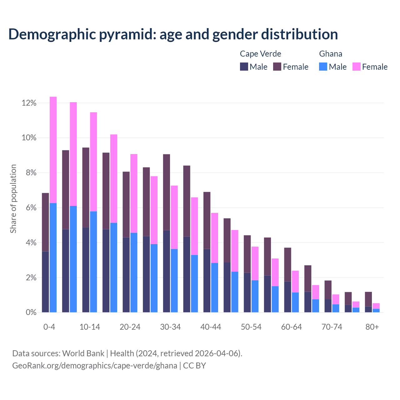 - Cape Verde is ranked 110/196 by median age (oldest to youngest) vs 146/196 for Ghana.