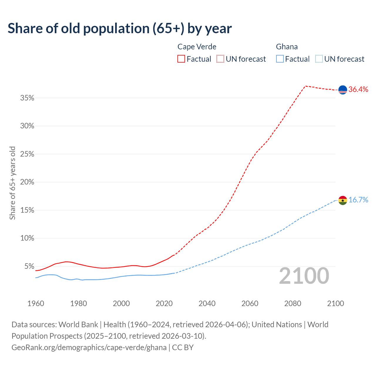 - The share of old-age demographic (65+) in Cape Verde is 6.86% vs 3.71% in Ghana.