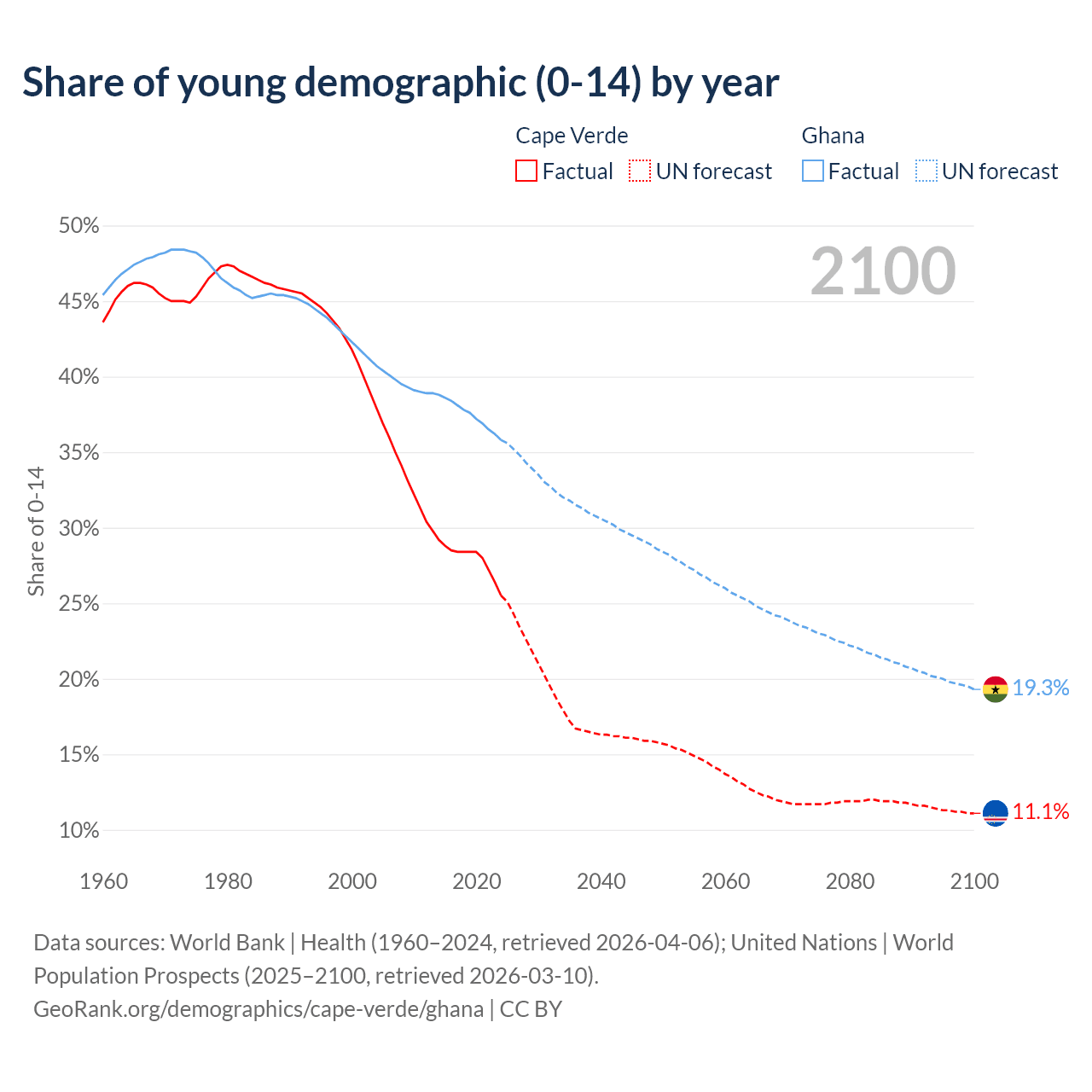 - The share of young demographic (0-15 years old) in Cape Verde is 25.5% vs 35.8% in Ghana.