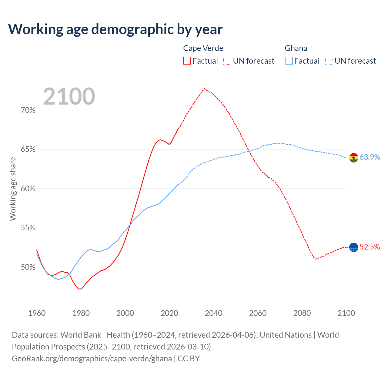 - Cape Verde has 359K working age adults (aged 15-64) vs 21.7M in Ghana.
