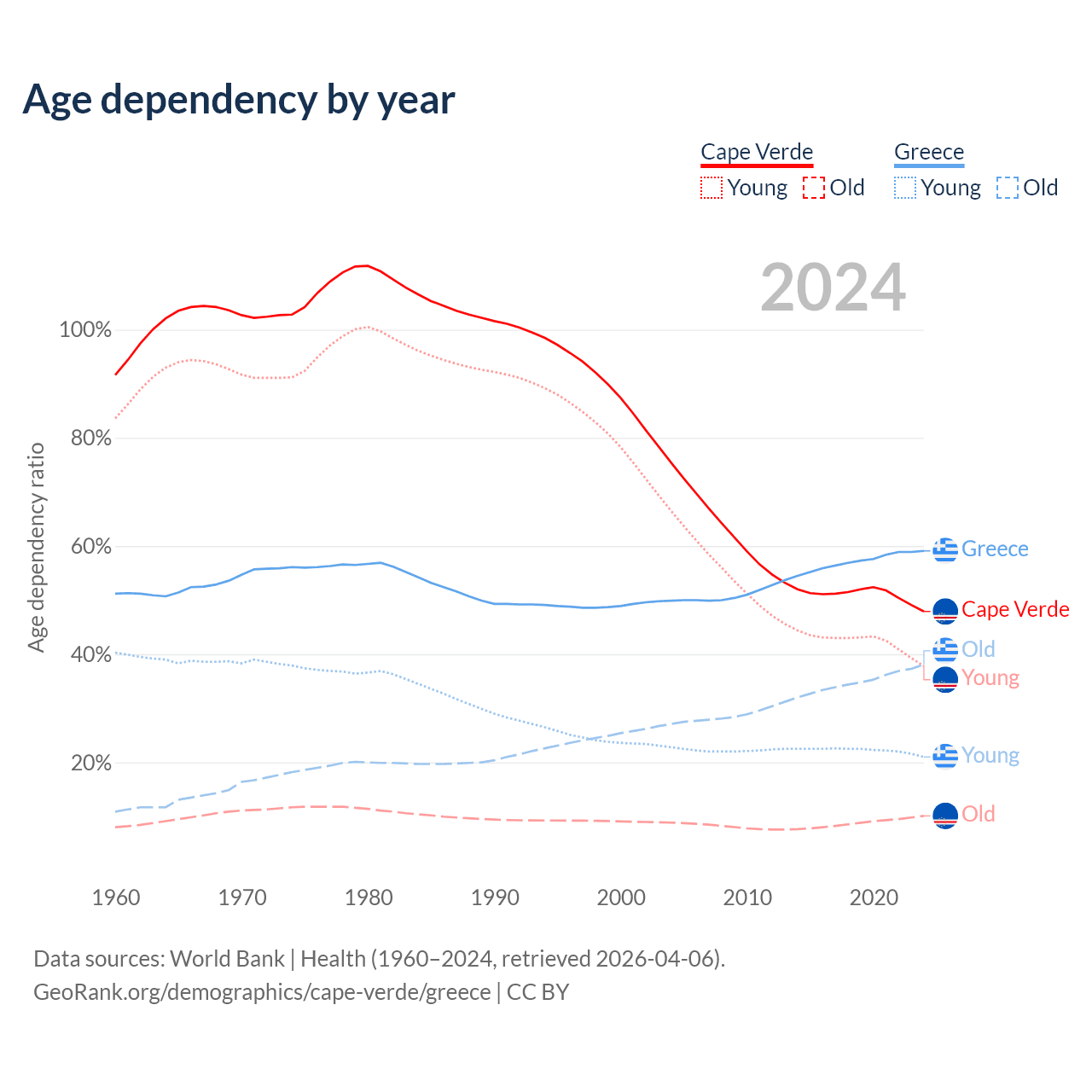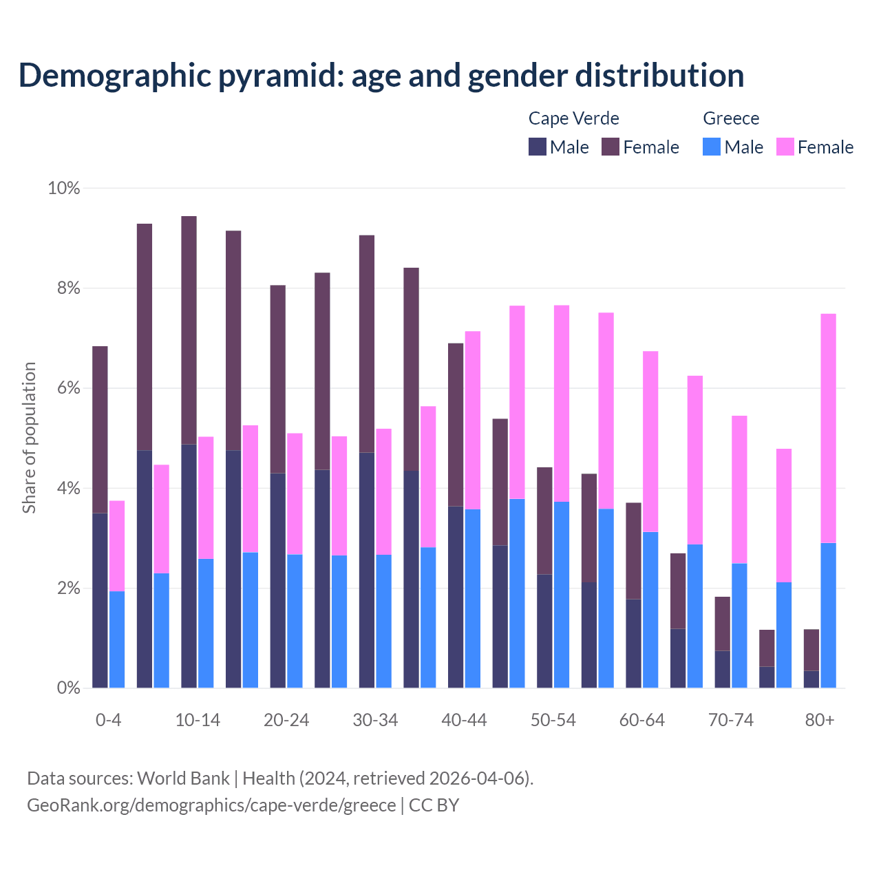 - Cape Verde is ranked 110/196 by median age (oldest to youngest) vs 6/196 for Greece.