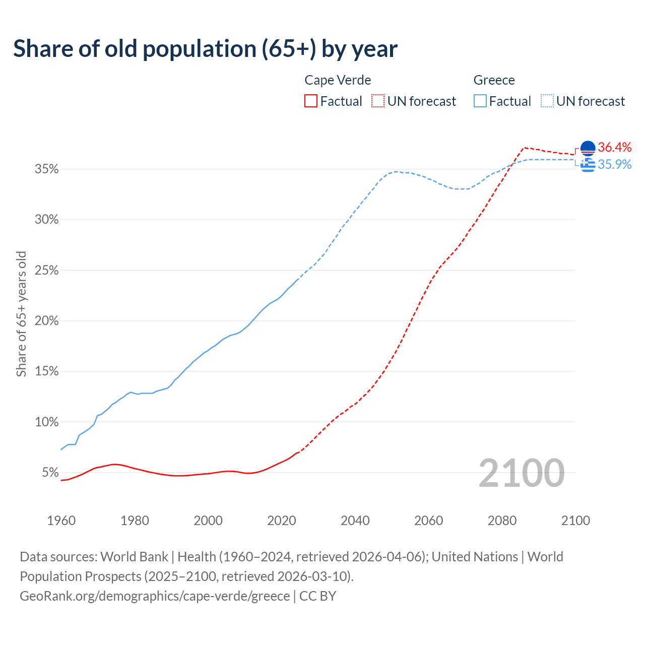 The share of older people aged 65 and over is 6.86% in Cape Verde and 23.9% in Greece. Life expectancy in Cape Verde compared to Greece .