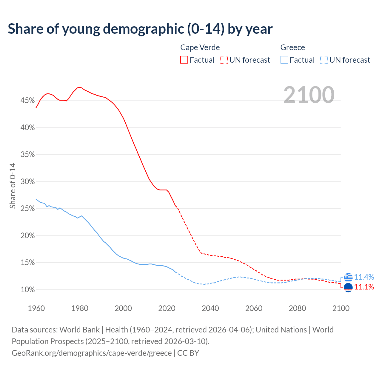 - The share of young demographic (0-15 years old) in Cape Verde is 25.5% vs 13.2% in Greece.