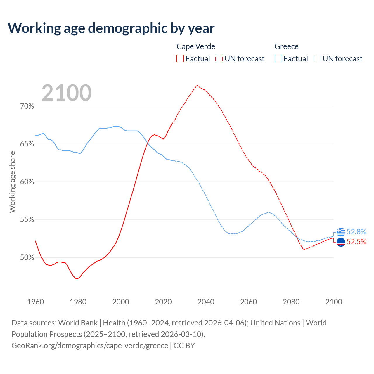 - Cape Verde has 359K working age adults (aged 15-64) vs 6.4M in Greece.