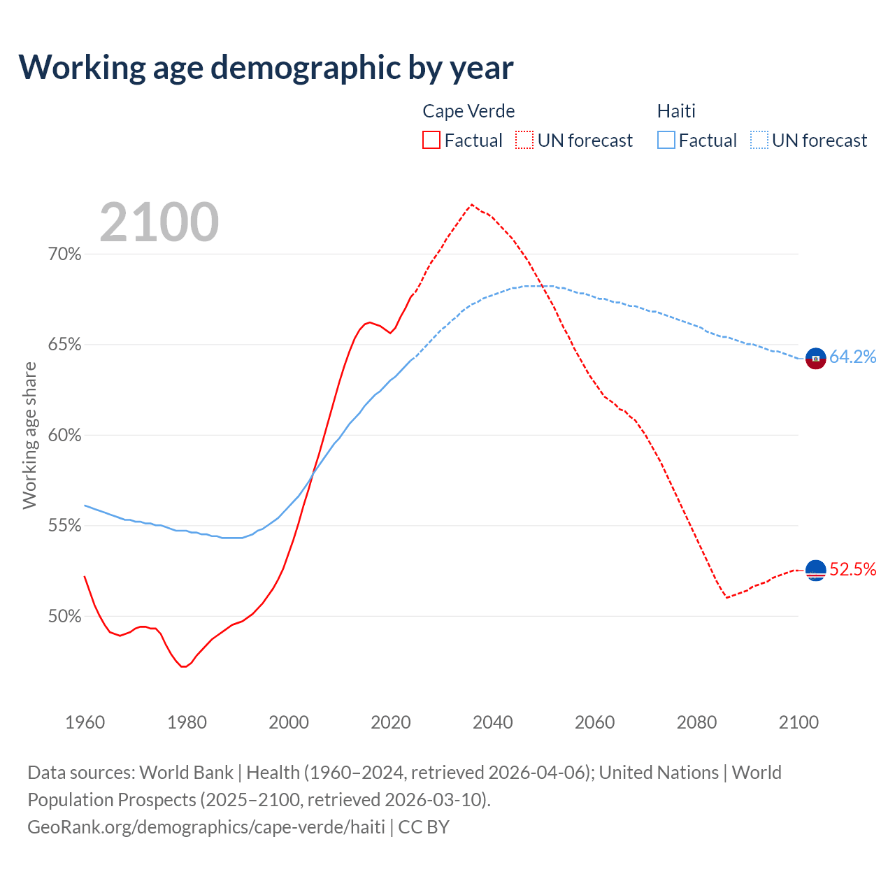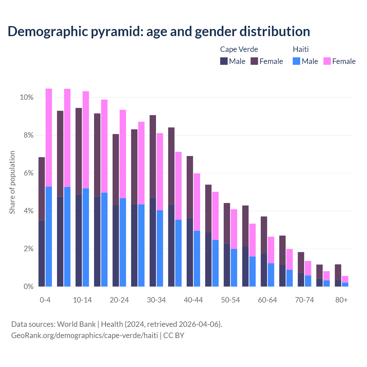 - Cape Verde is ranked 110/196 by median age (oldest to youngest) vs 135/196 for Haiti.