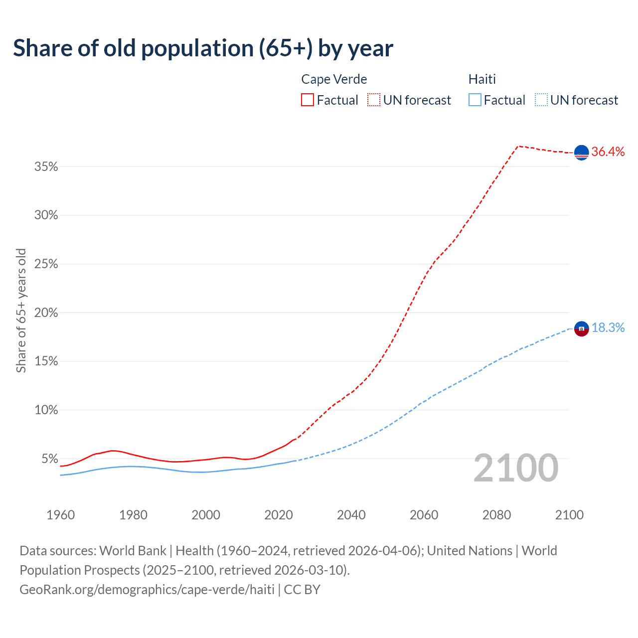 - The share of old-age demographic (65+) in Cape Verde is 6.86% vs 4.71% in Haiti.