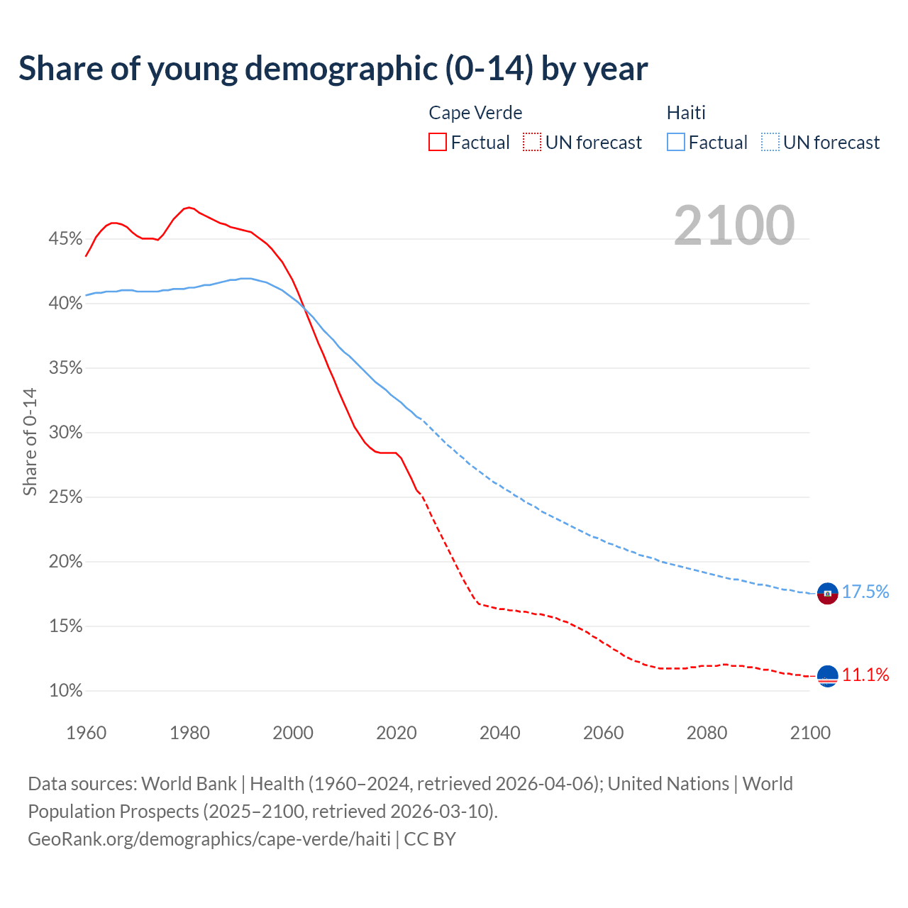 - The share of young demographic (0-15 years old) in Cape Verde is 25.5% vs 31.2% in Haiti.