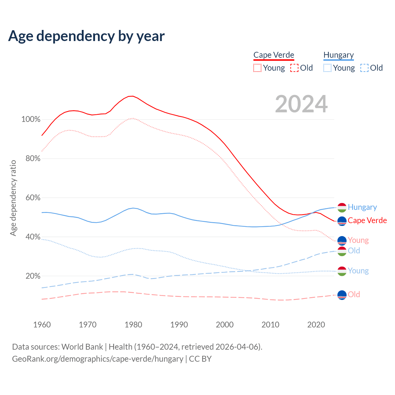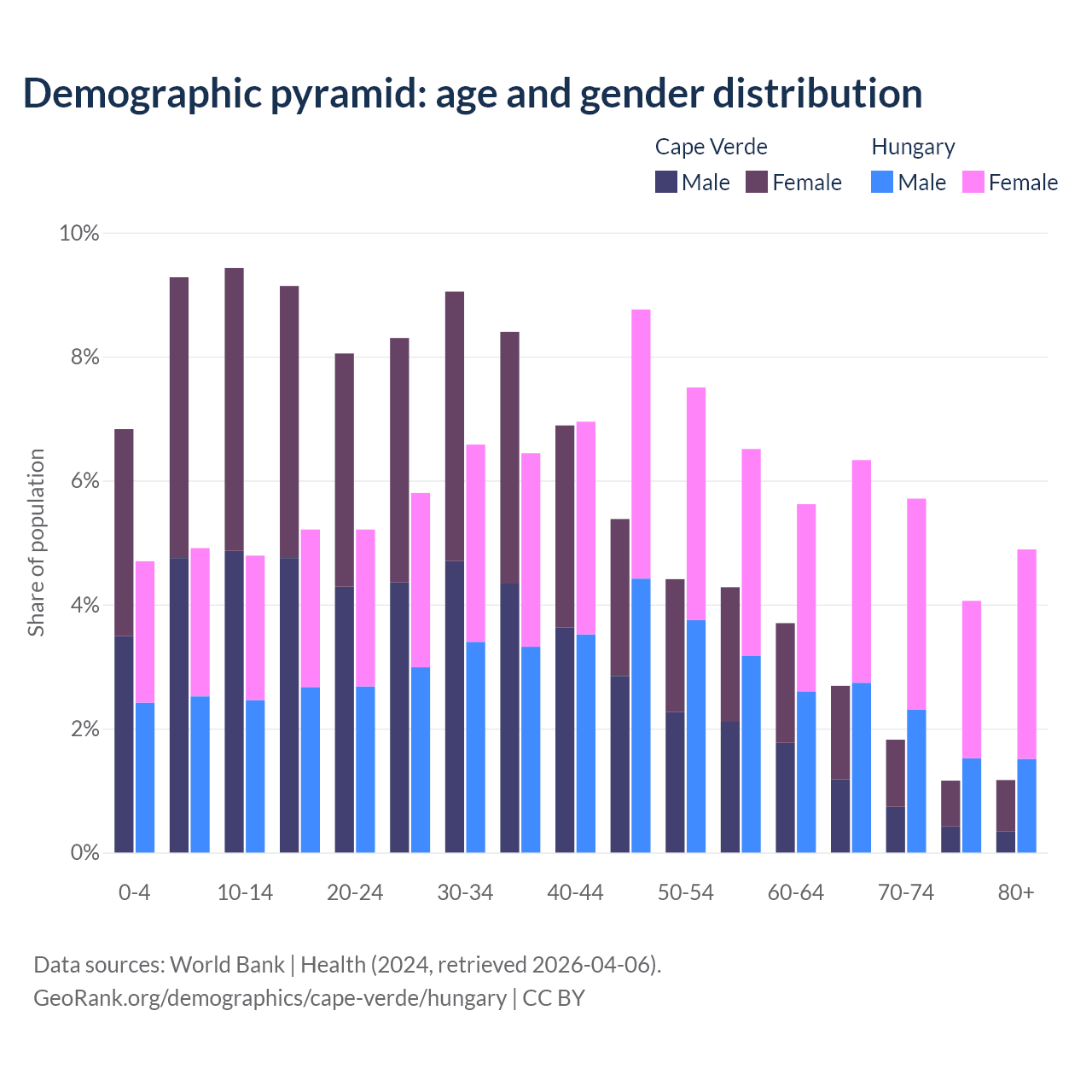 - Cape Verde is ranked 110/196 by median age (oldest to youngest) vs 17/196 for Hungary.