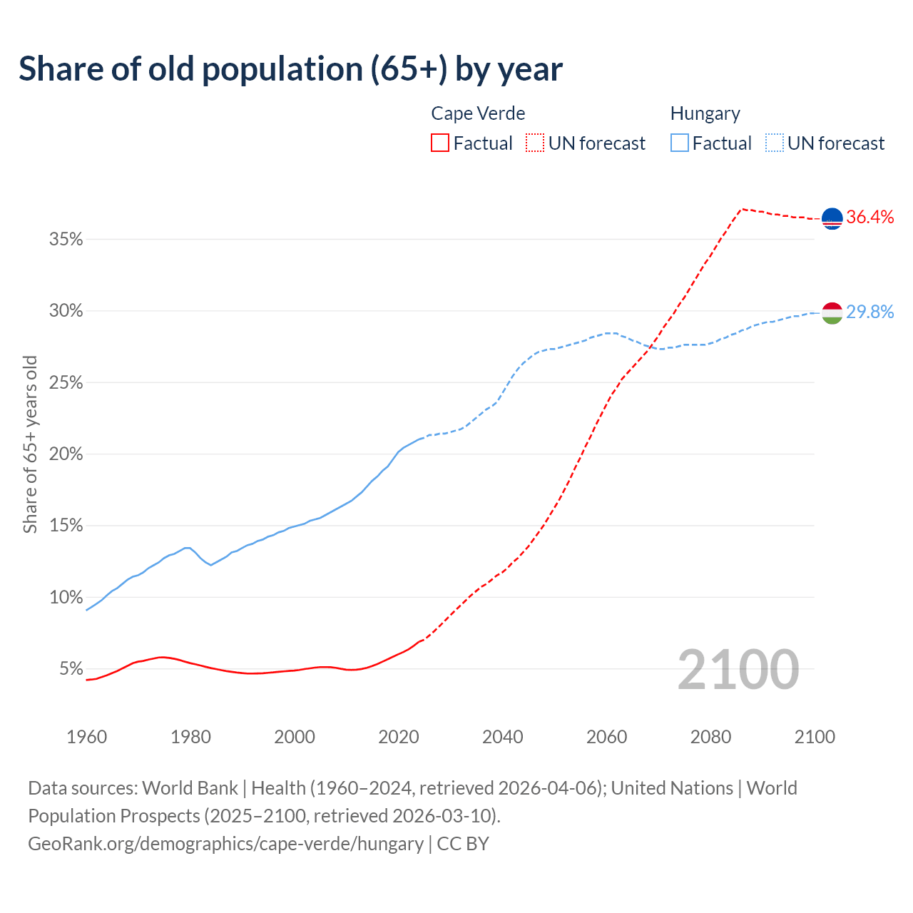 The share of older people aged 65 and over is 6.86% in Cape Verde and 21% in Hungary. Life expectancy in Cape Verde compared to Hungary .