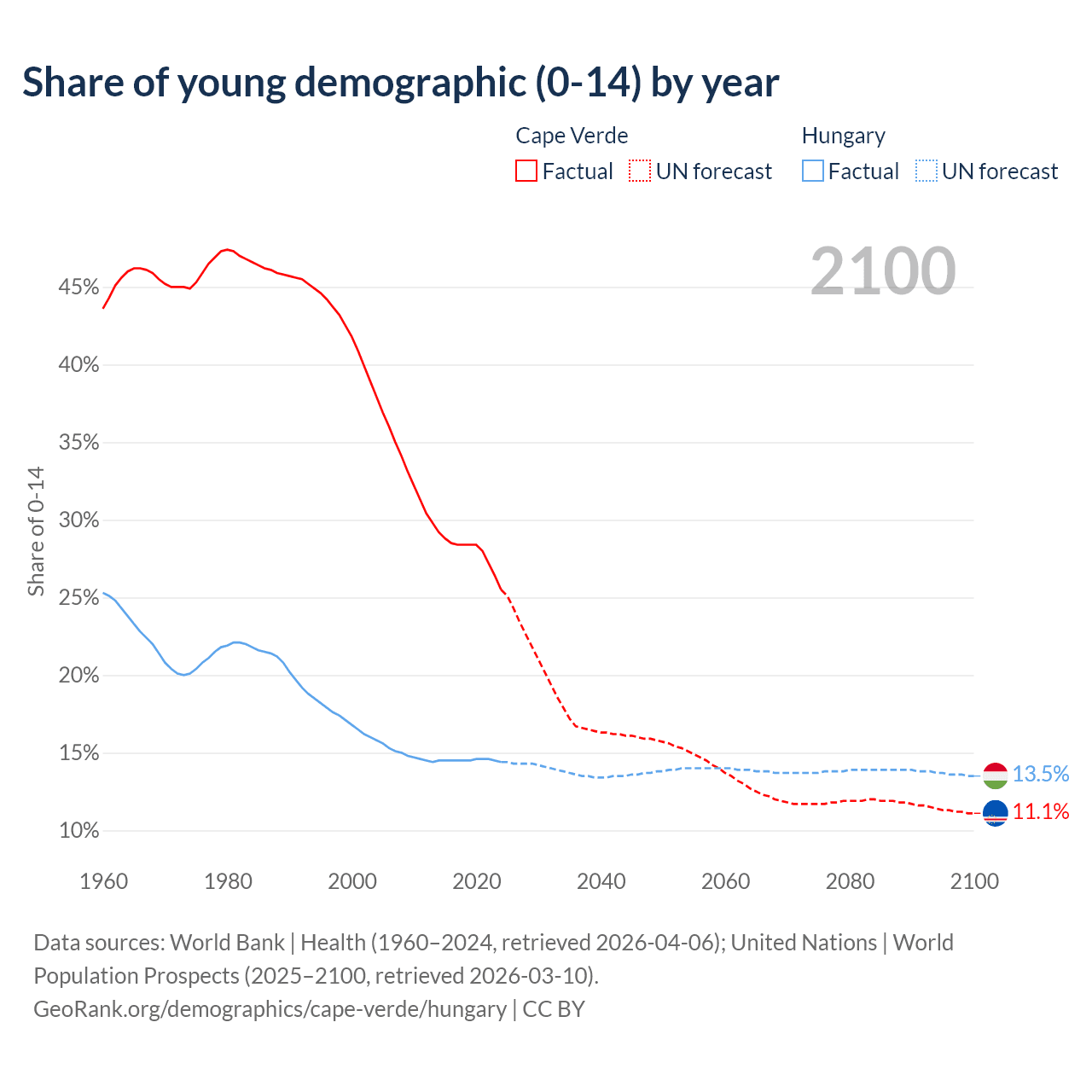 - The share of young demographic (0-15 years old) in Cape Verde is 25.5% vs 14.4% in Hungary.