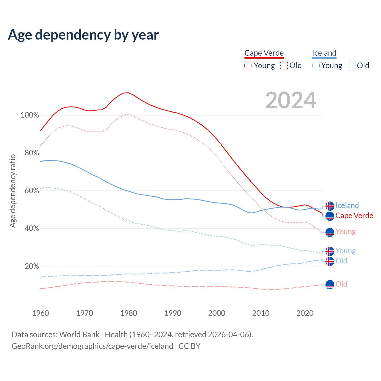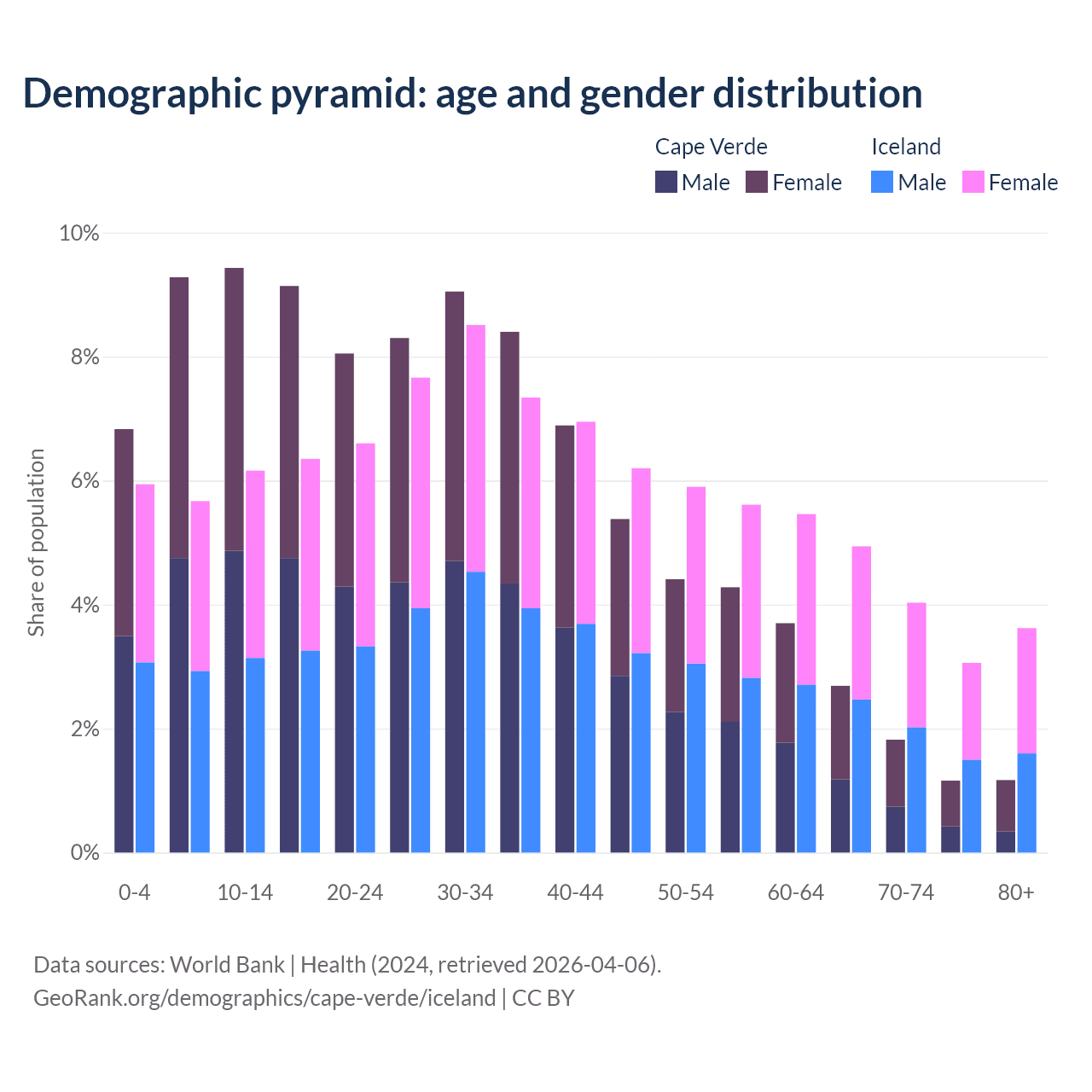 - The share of young demographic (0-15 years old) in Cape Verde is 25.5% vs 17.8% in Iceland.
