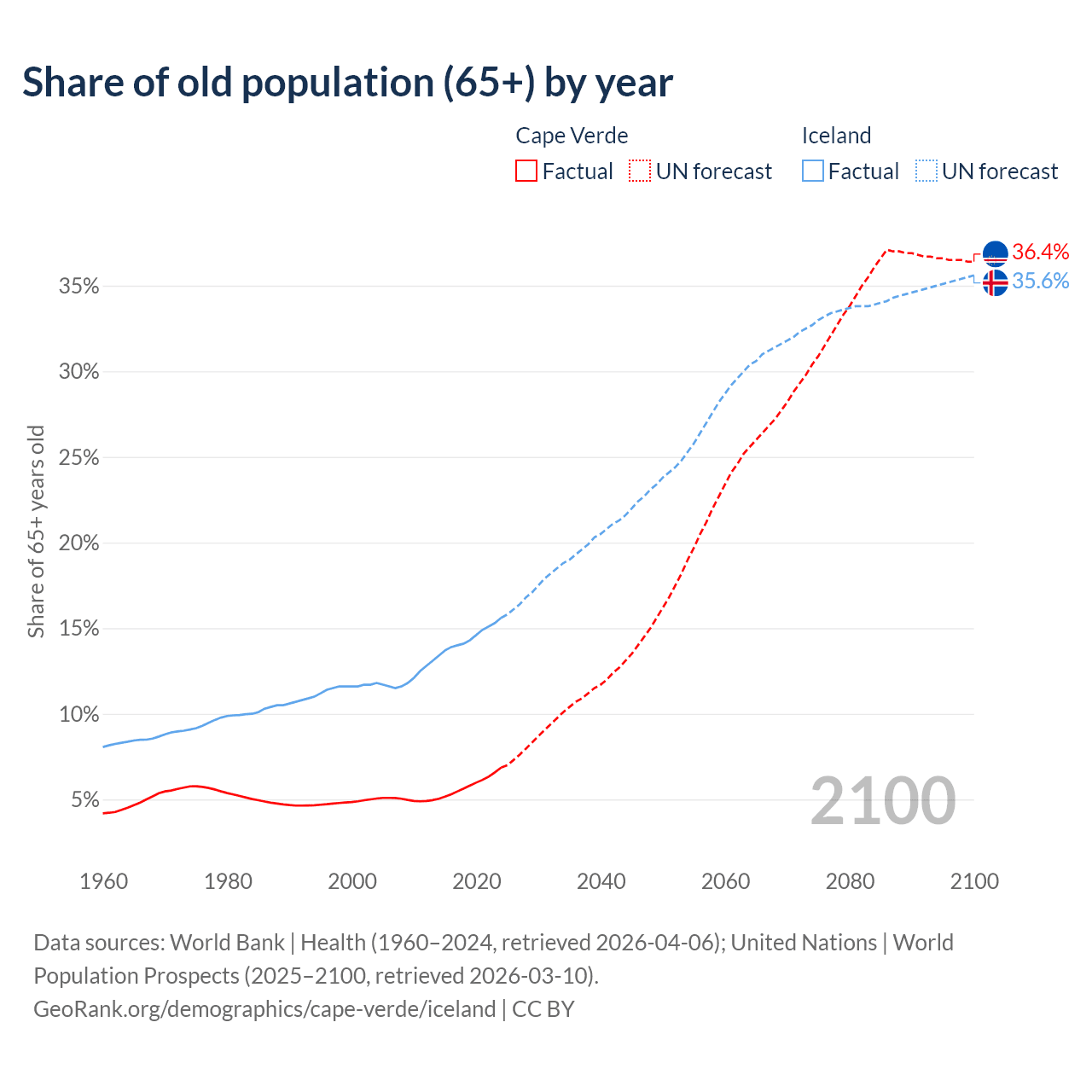 The share of older people aged 65 and over is 6.86% in Cape Verde and 15.6% in Iceland. Life expectancy in Cape Verde compared to Iceland .