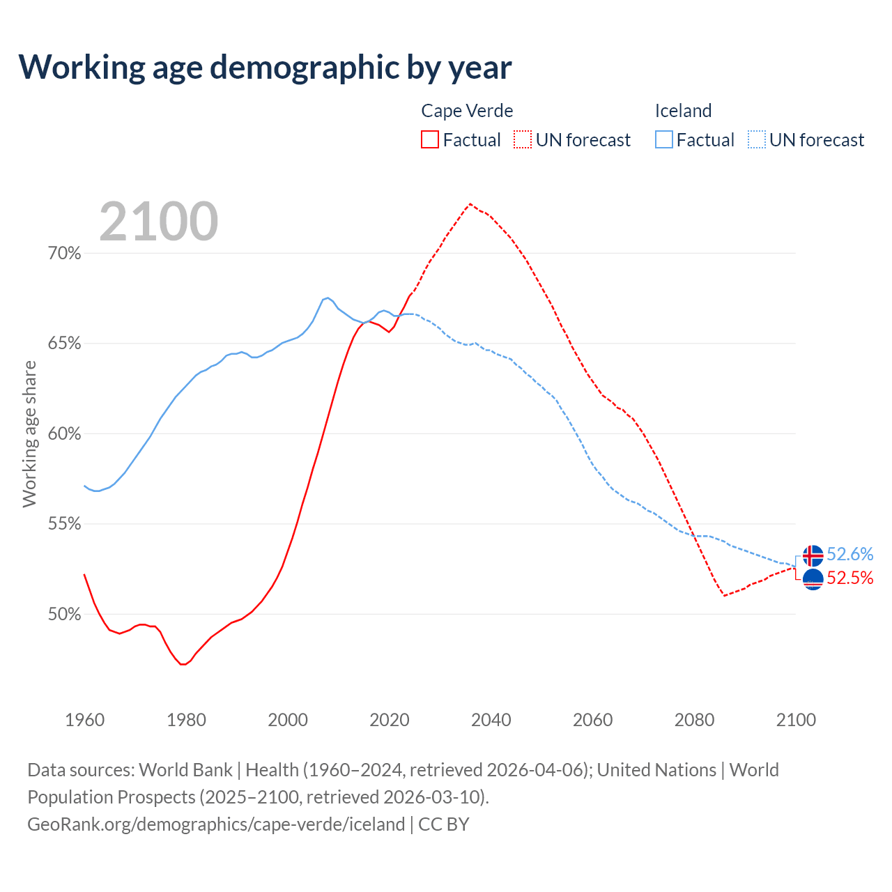 Median age Cape Verde vs Iceland, 1960-2100