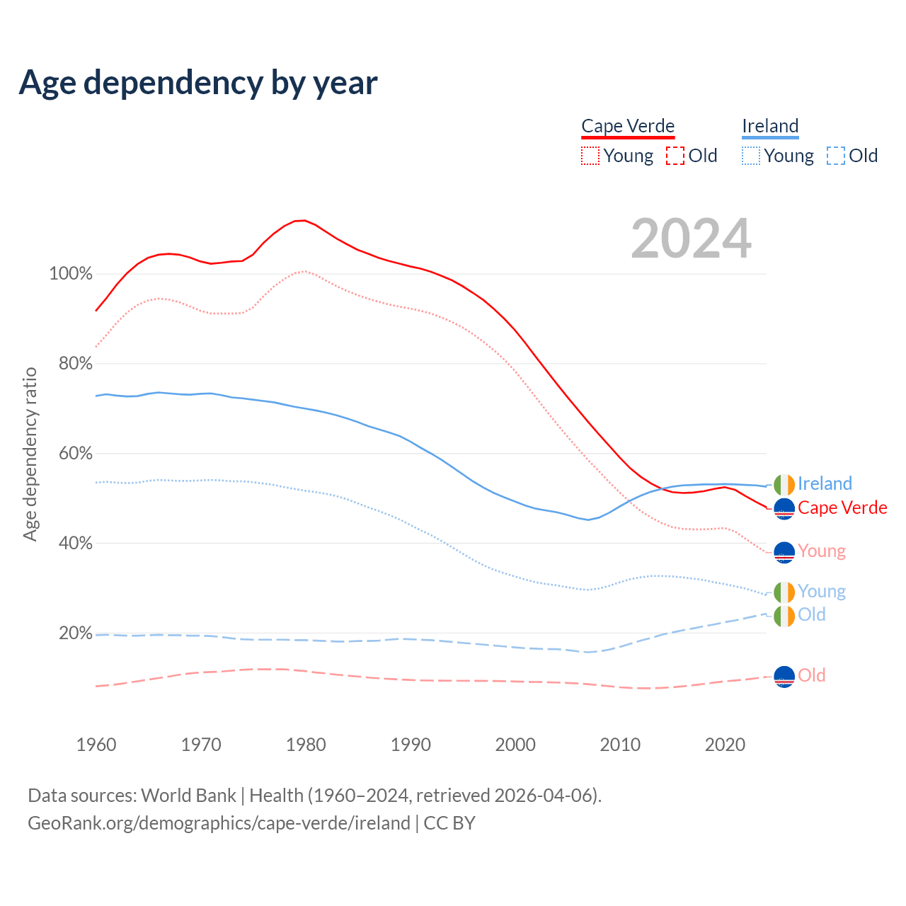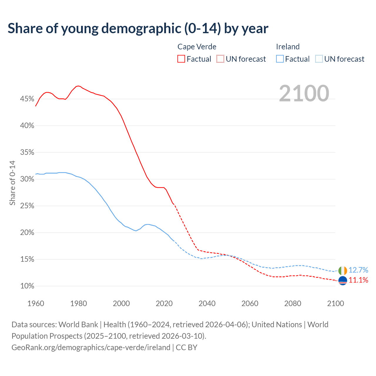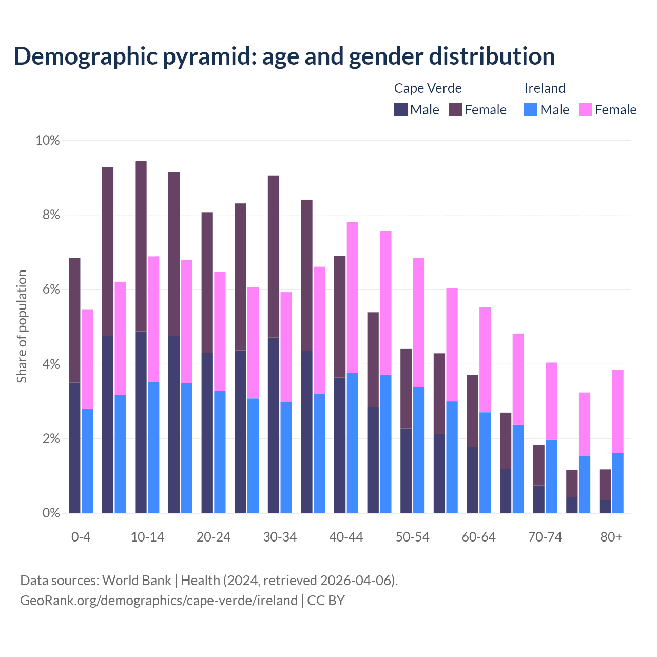 - The share of young demographic (0-15 years old) in Cape Verde is 25.5% vs 18.6% in Ireland.