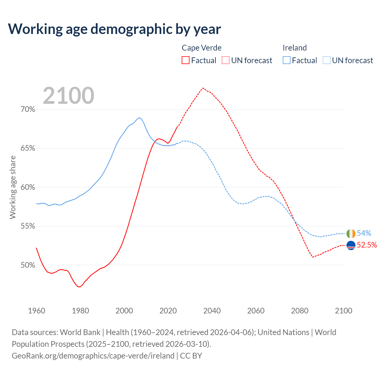 Median age Cape Verde vs Ireland, 1960-2100