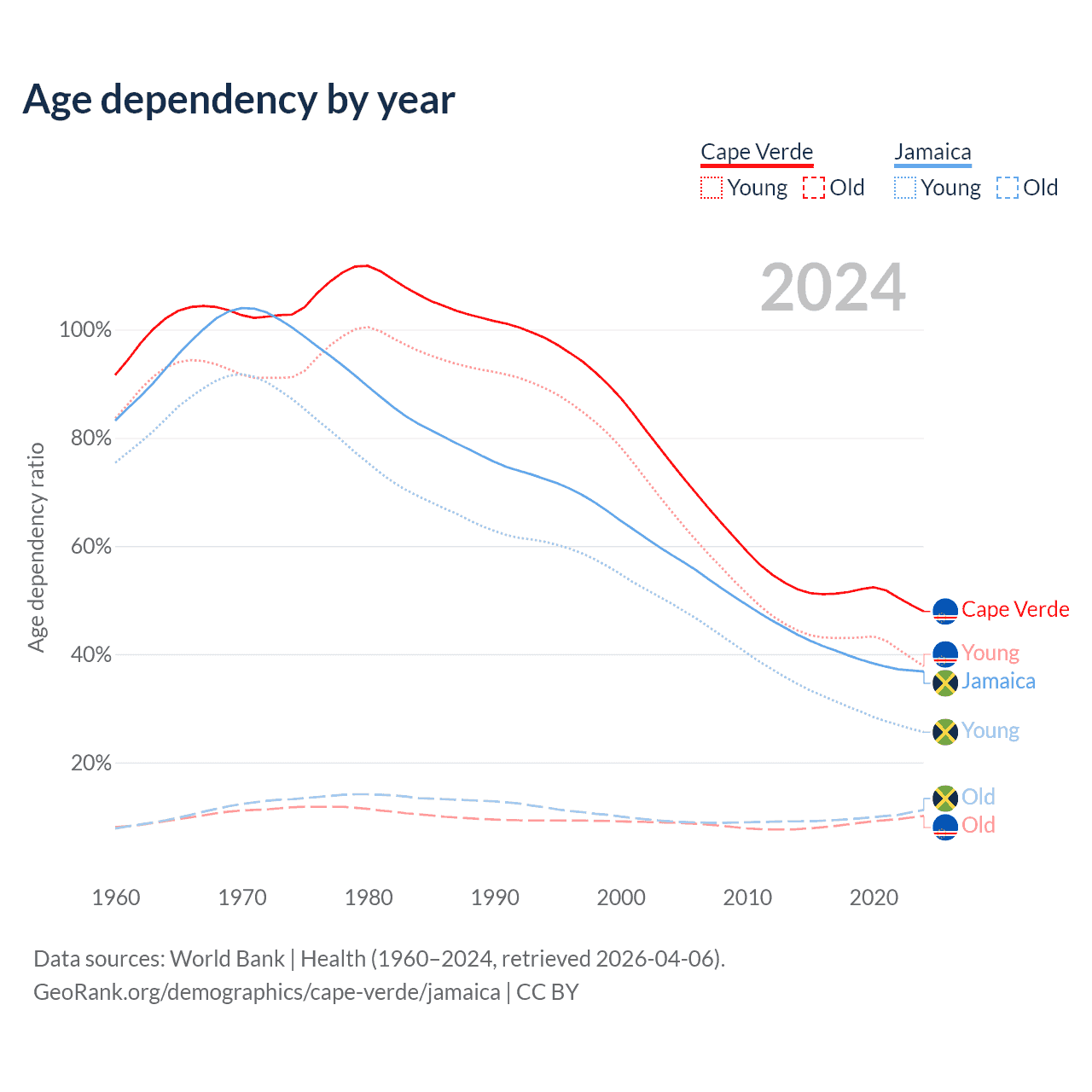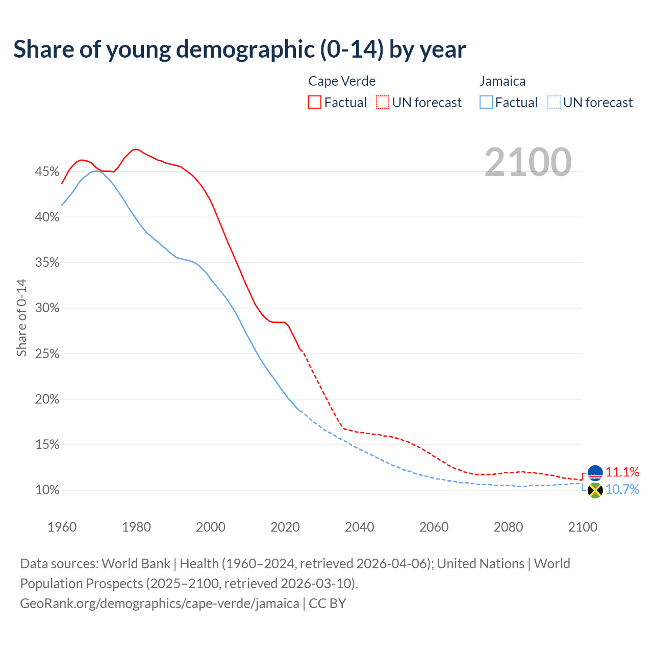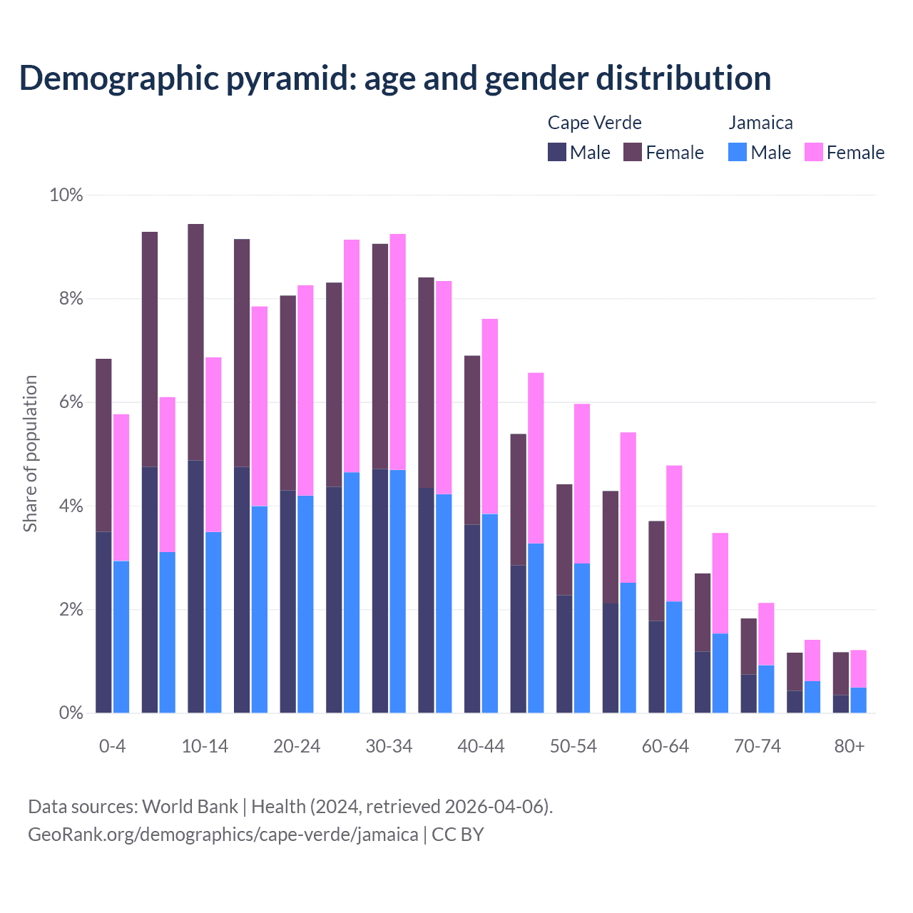 - The share of young demographic (0-15 years old) in Cape Verde is 25.5% vs 18.7% in Jamaica.