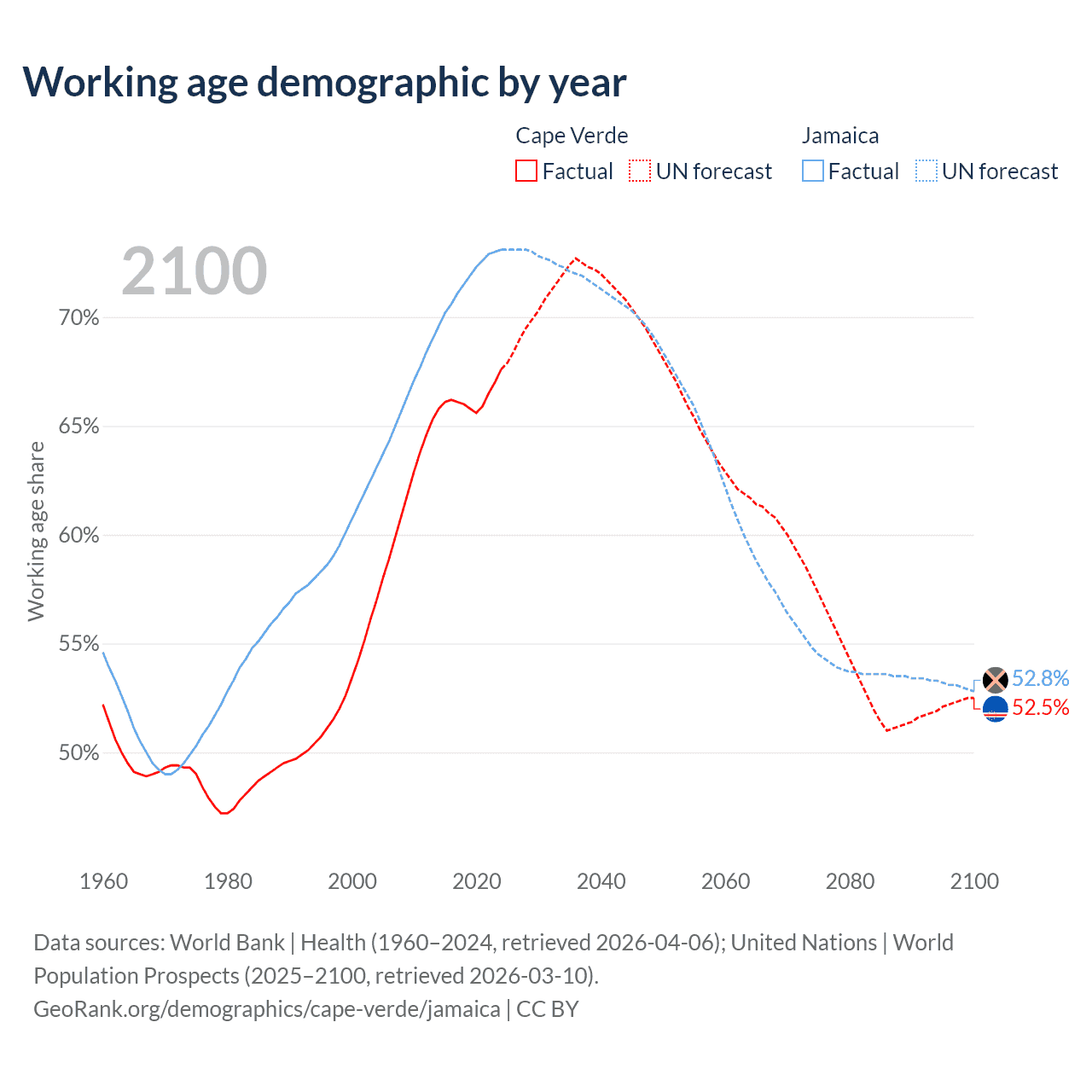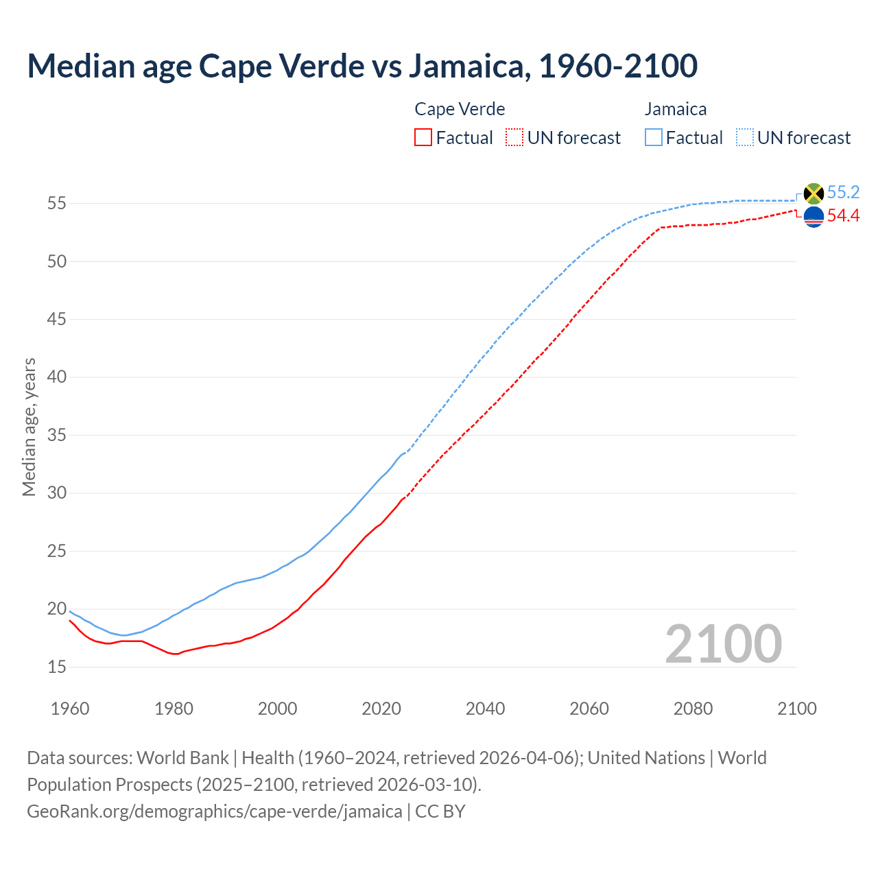 Median age Cape Verde vs Jamaica, 1960-2100