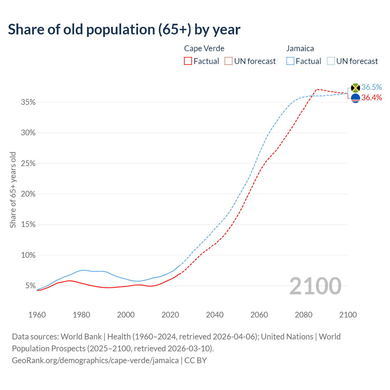 The share of older people aged 65 and over is 6.86% in Cape Verde and 8.21% in Jamaica. Life expectancy in Cape Verde compared to Jamaica .