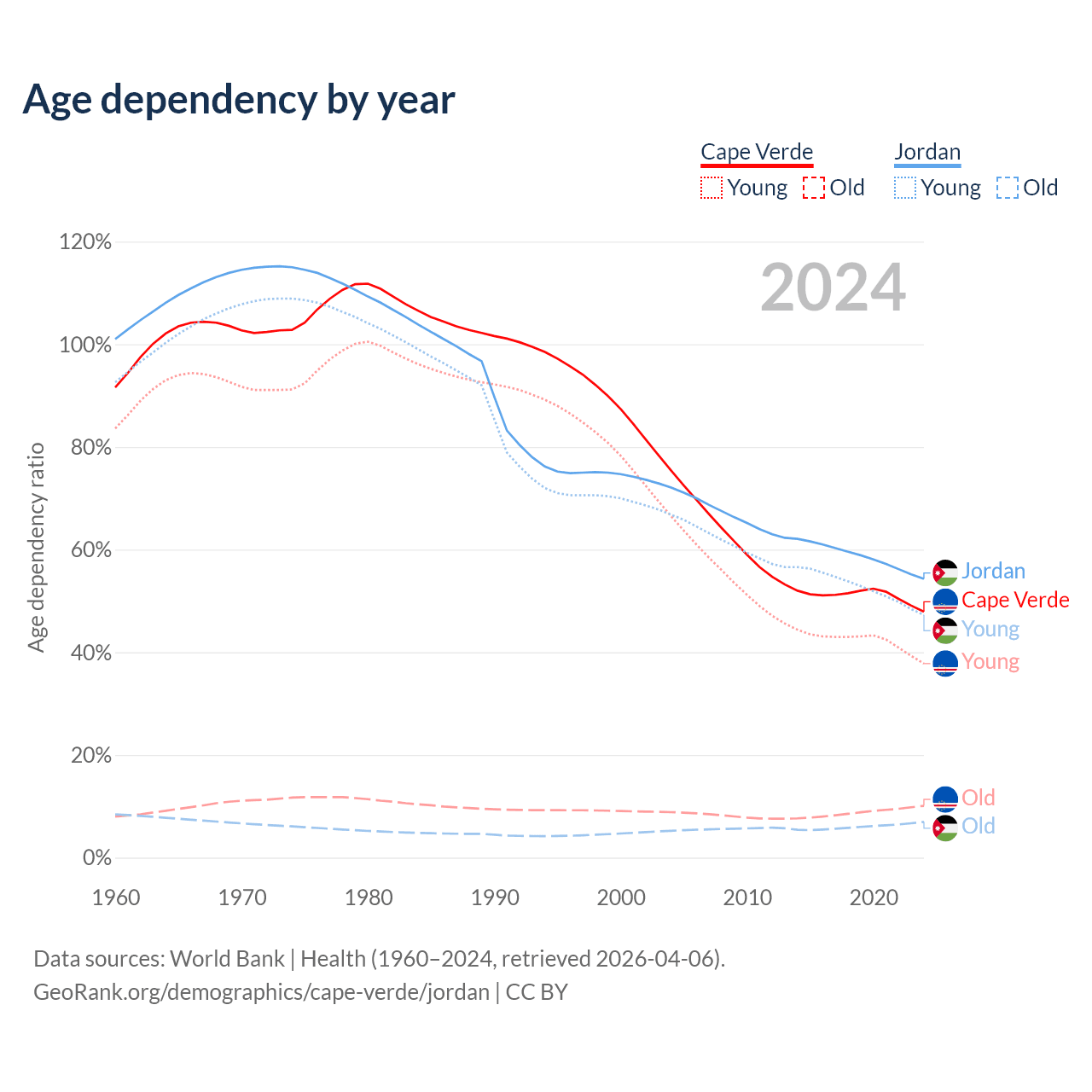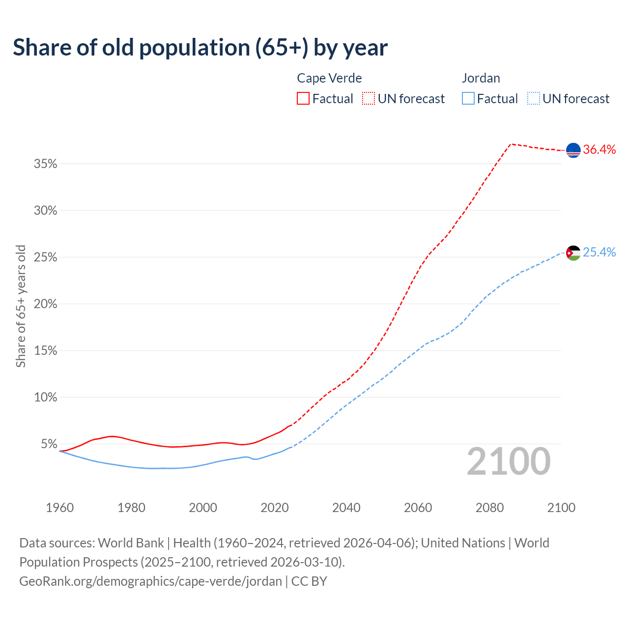 - The share of old-age demographic (65+) in Cape Verde is 6.86% vs 4.52% in Jordan.