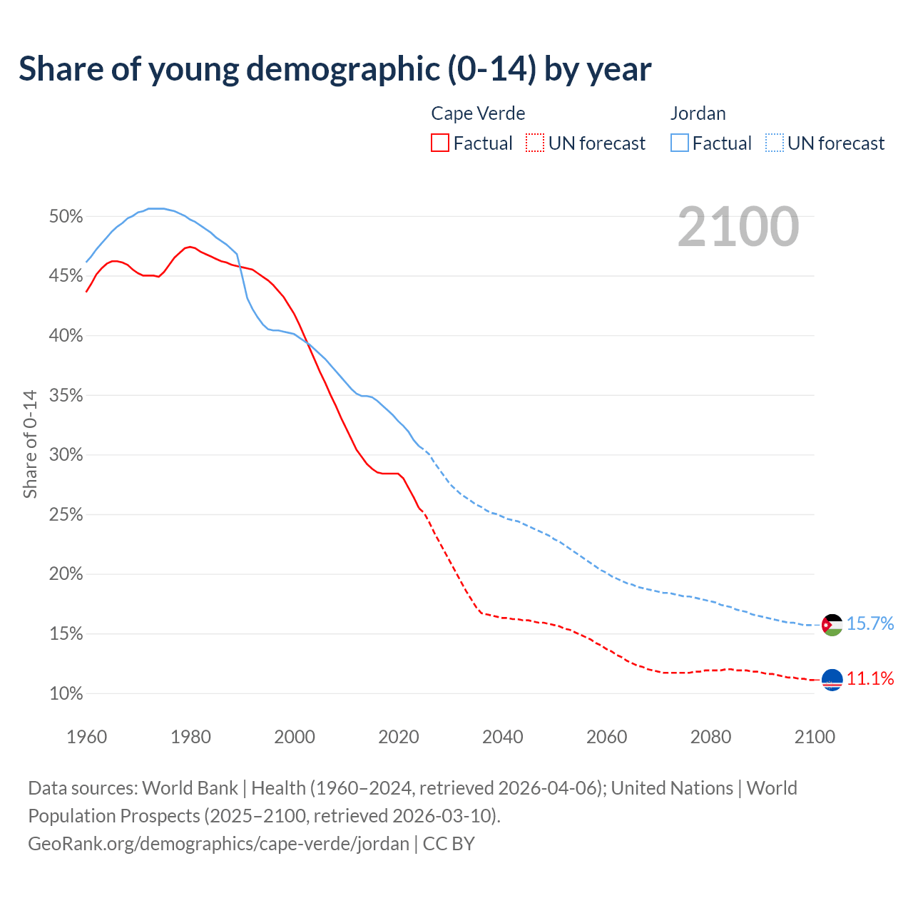 - The share of young demographic (0-15 years old) in Cape Verde is 25.5% vs 30.7% in Jordan.
