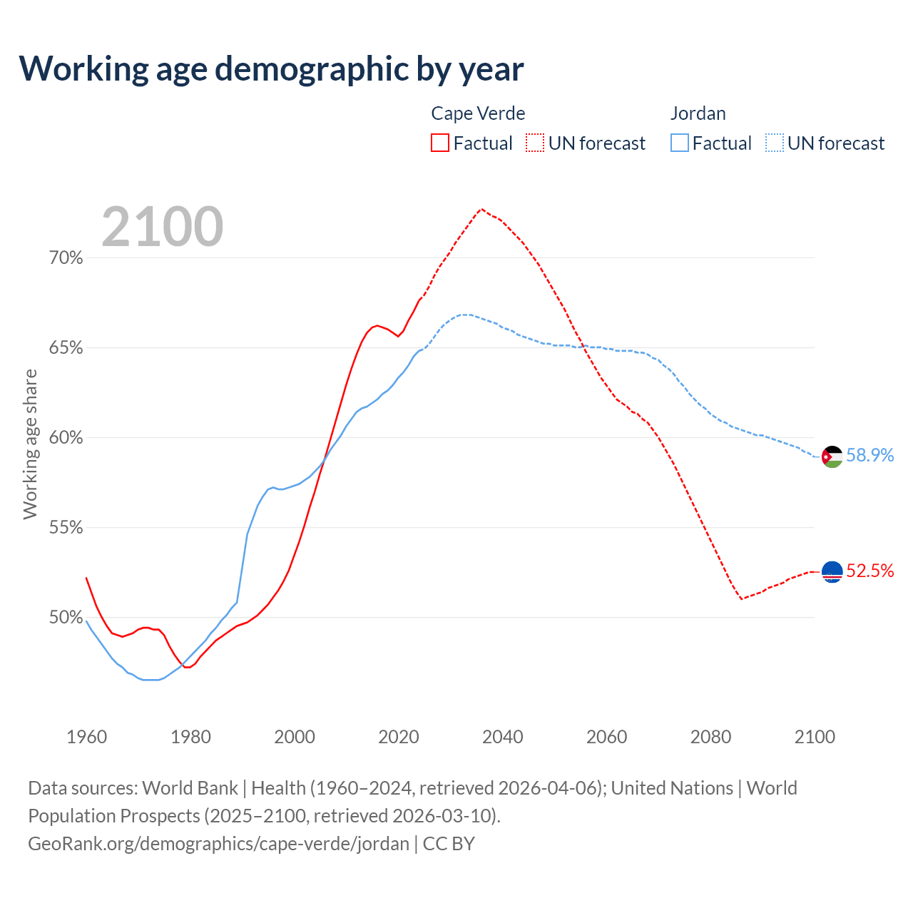 - Cape Verde has 359K working age adults (aged 15-64) vs 7.49M in Jordan.