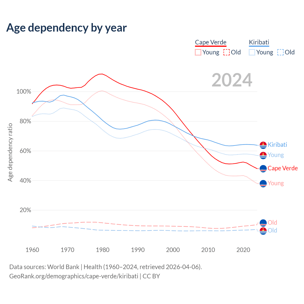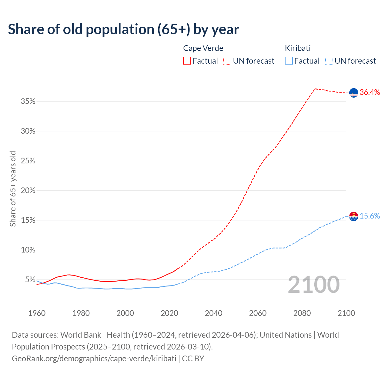 - The share of old-age demographic (65+) in Cape Verde is 6.86% vs 4.24% in Kiribati.