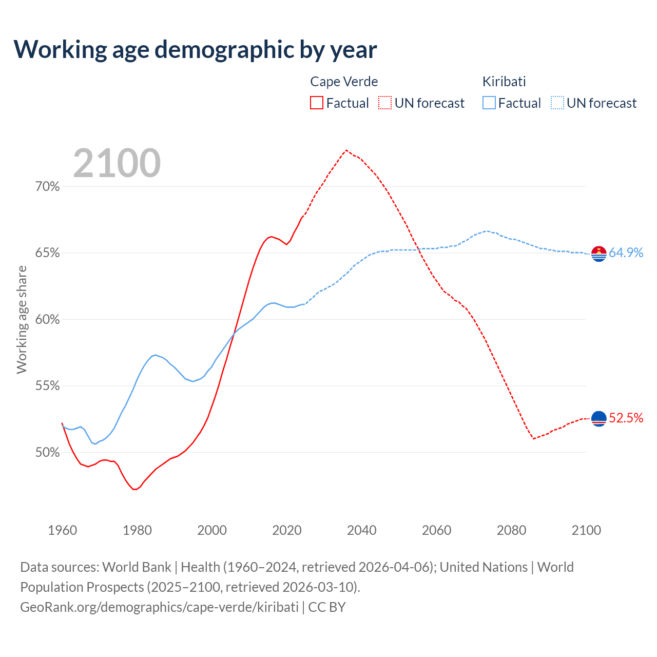 - Cape Verde has 359K working age adults (aged 15-64) vs 84.9K in Kiribati.