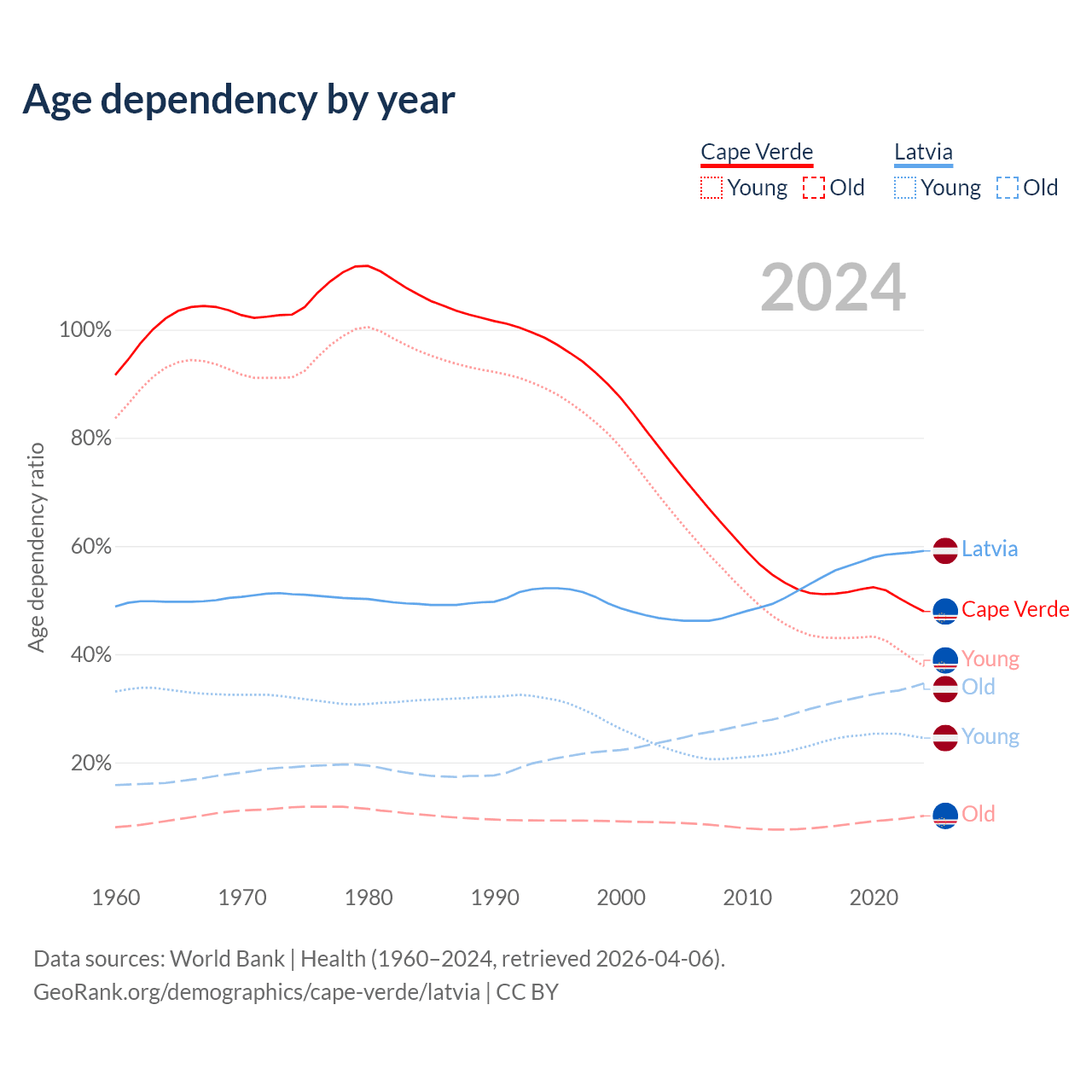 - The share of young demographic (0-15 years old) in Cape Verde is 25.5% vs 15.4% in Latvia.