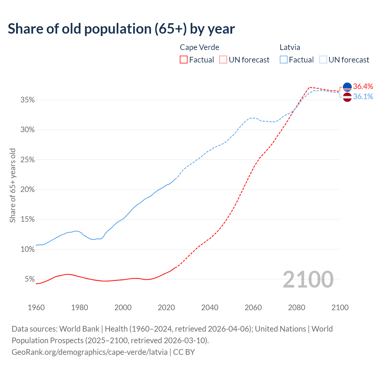 - The share of old-age demographic (65+) in Cape Verde is 6.86% vs 21.7% in Latvia.