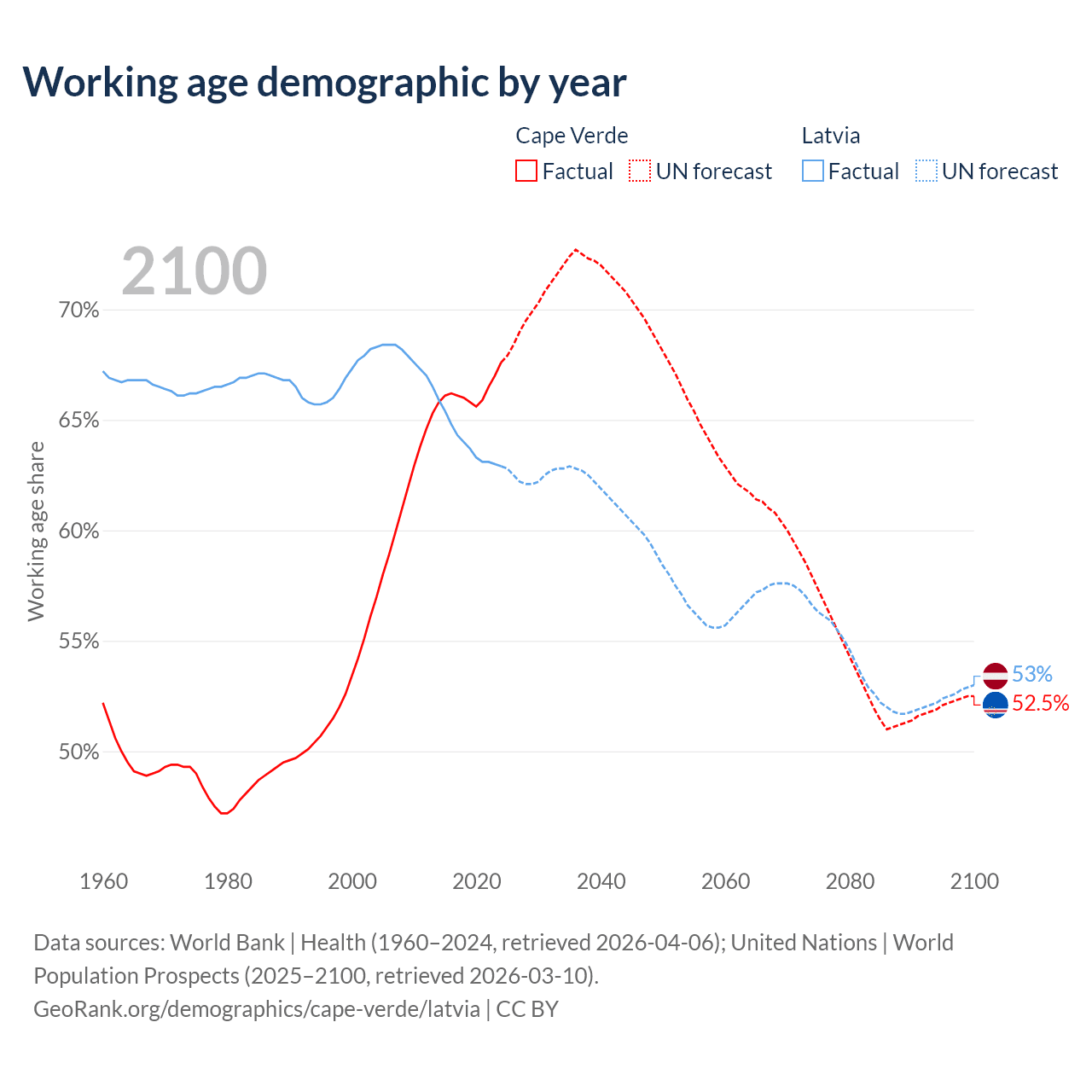 Median age Cape Verde vs Latvia, 1960-2100