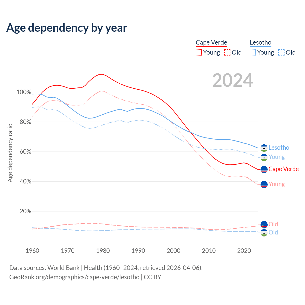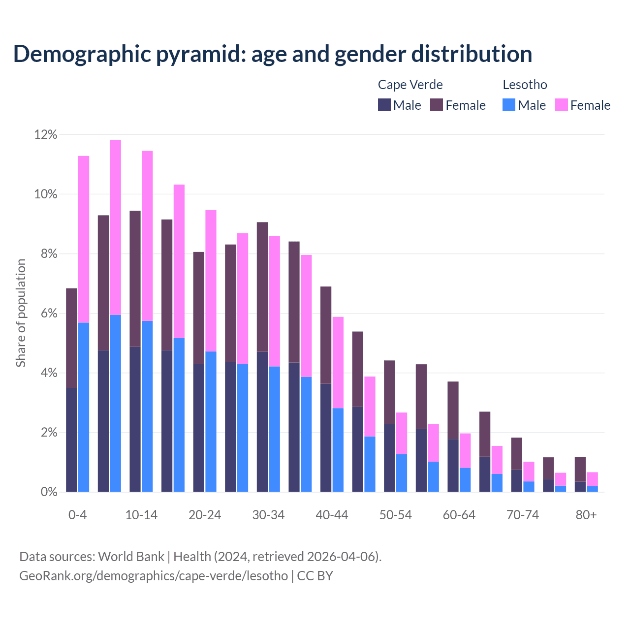 - Cape Verde is ranked 110/196 by median age (oldest to youngest) vs 143/196 for Lesotho.
