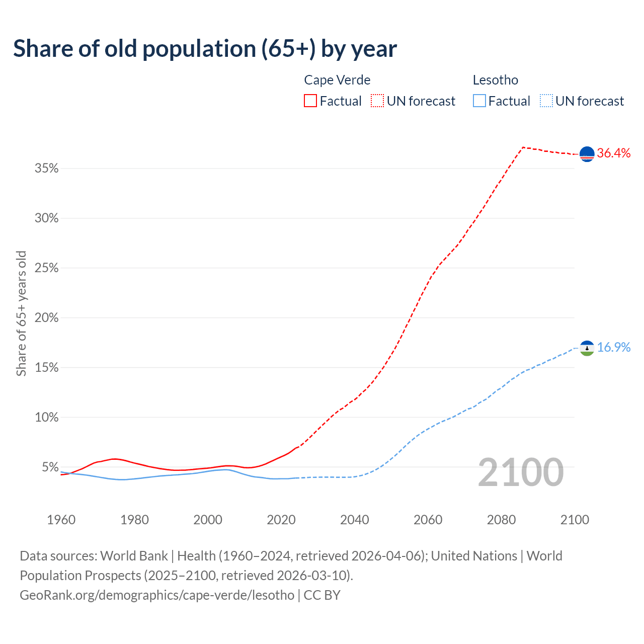 - The share of old-age demographic (65+) in Cape Verde is 6.86% vs 3.86% in Lesotho.