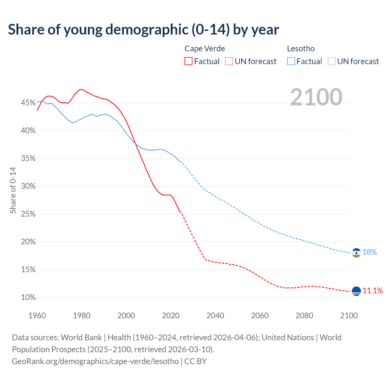 - The share of young demographic (0-15 years old) in Cape Verde is 25.5% vs 34.5% in Lesotho.