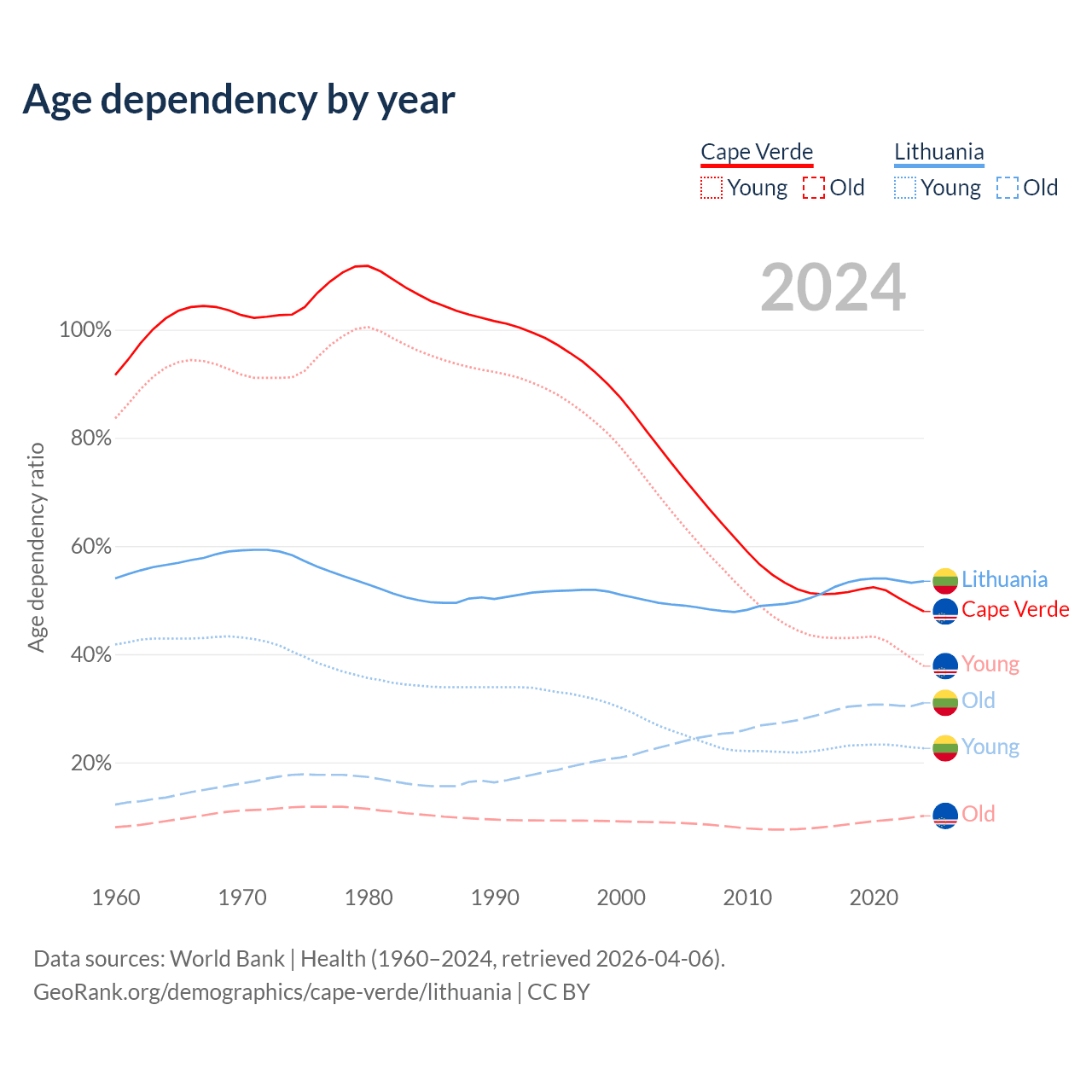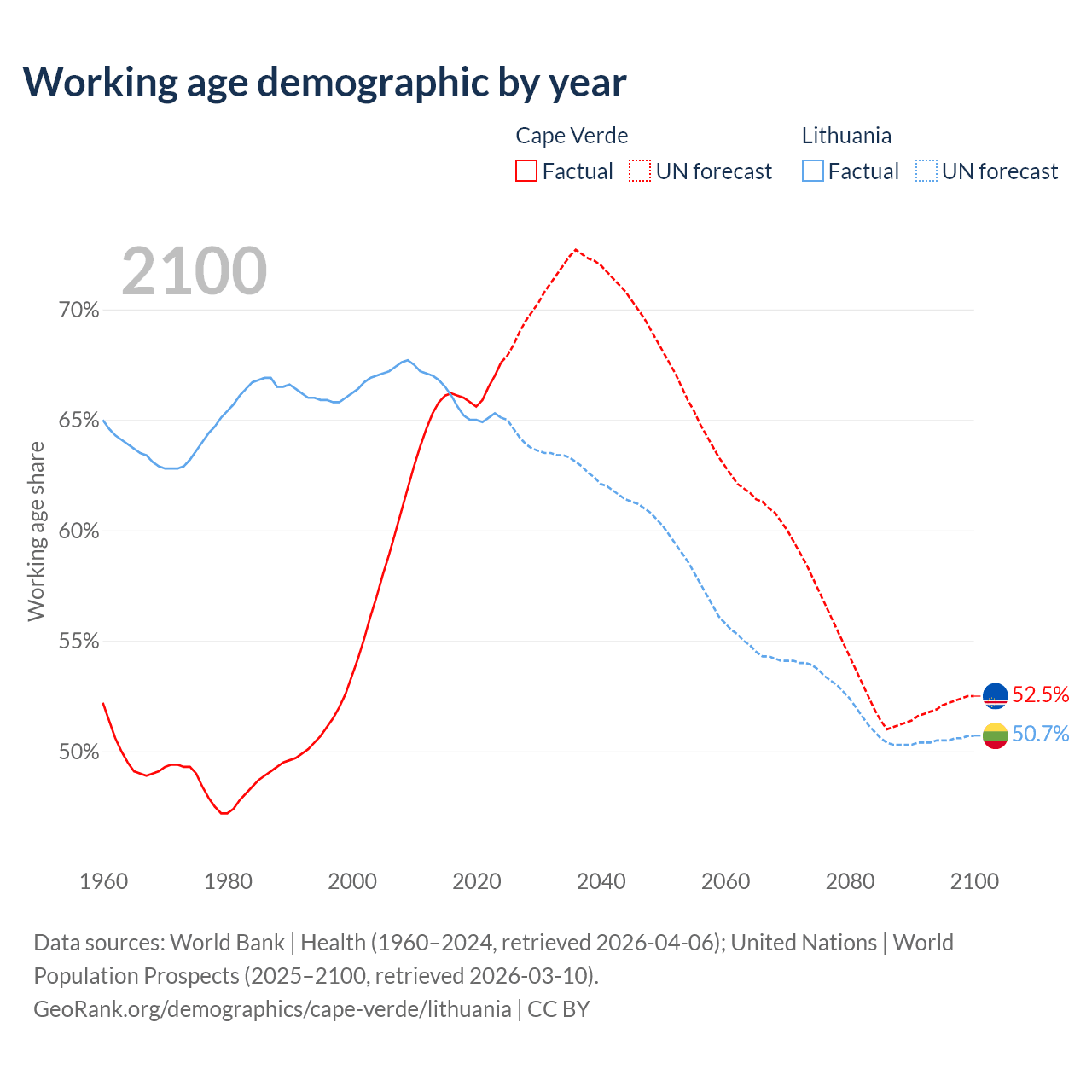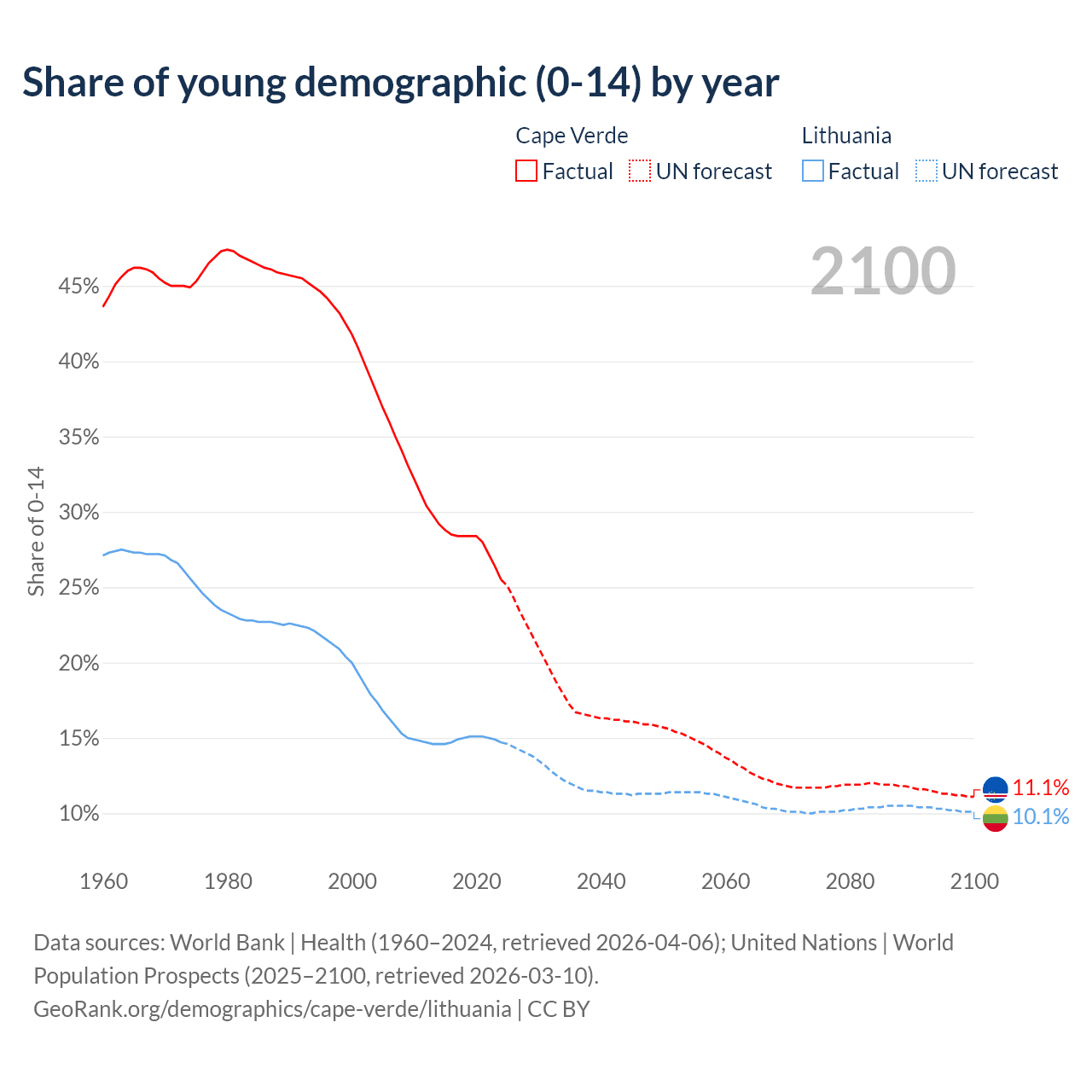 - The share of young demographic (0-15 years old) in Cape Verde is 25.5% vs 14.7% in Lithuania.